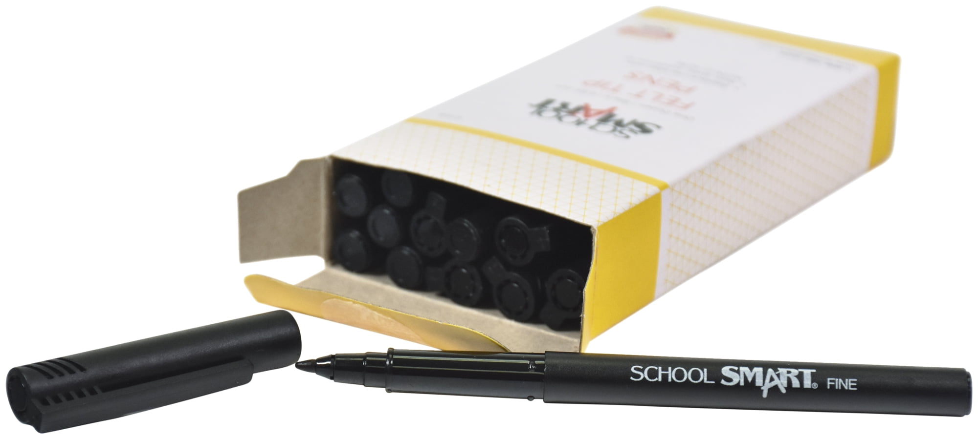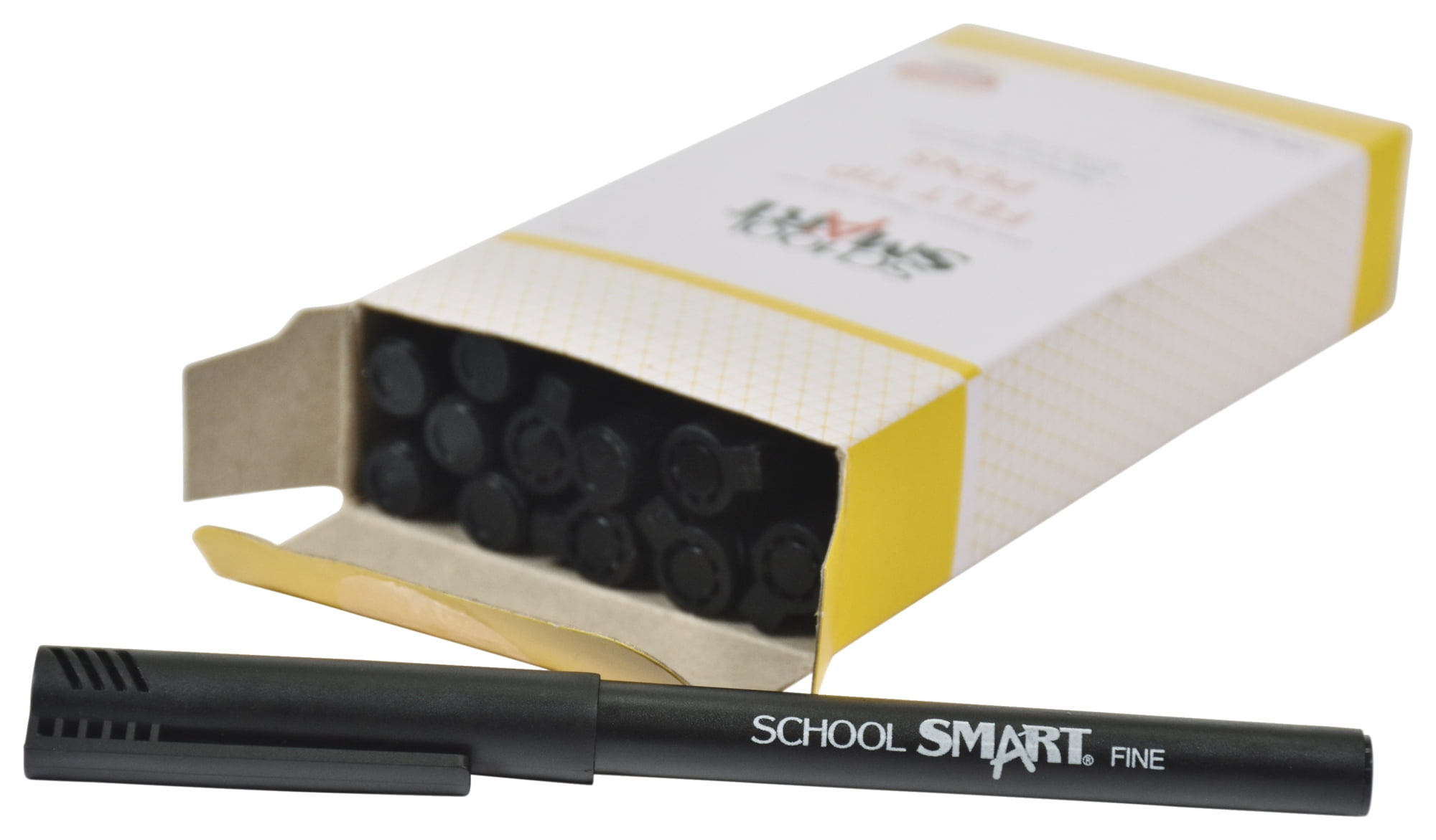 This School Smart Black Felt Tip Pen features bright, non-toxic, water-based ink. Fine nylon fiber tip, measuring 0.85 mm, writes clean, medium weight lines and won’t mush down. Black pen is ideal for use at home or in the classroom. Sold as 12 per pack. AP Certified; non-toxic. Includes:12 Fine Tip Black Pens