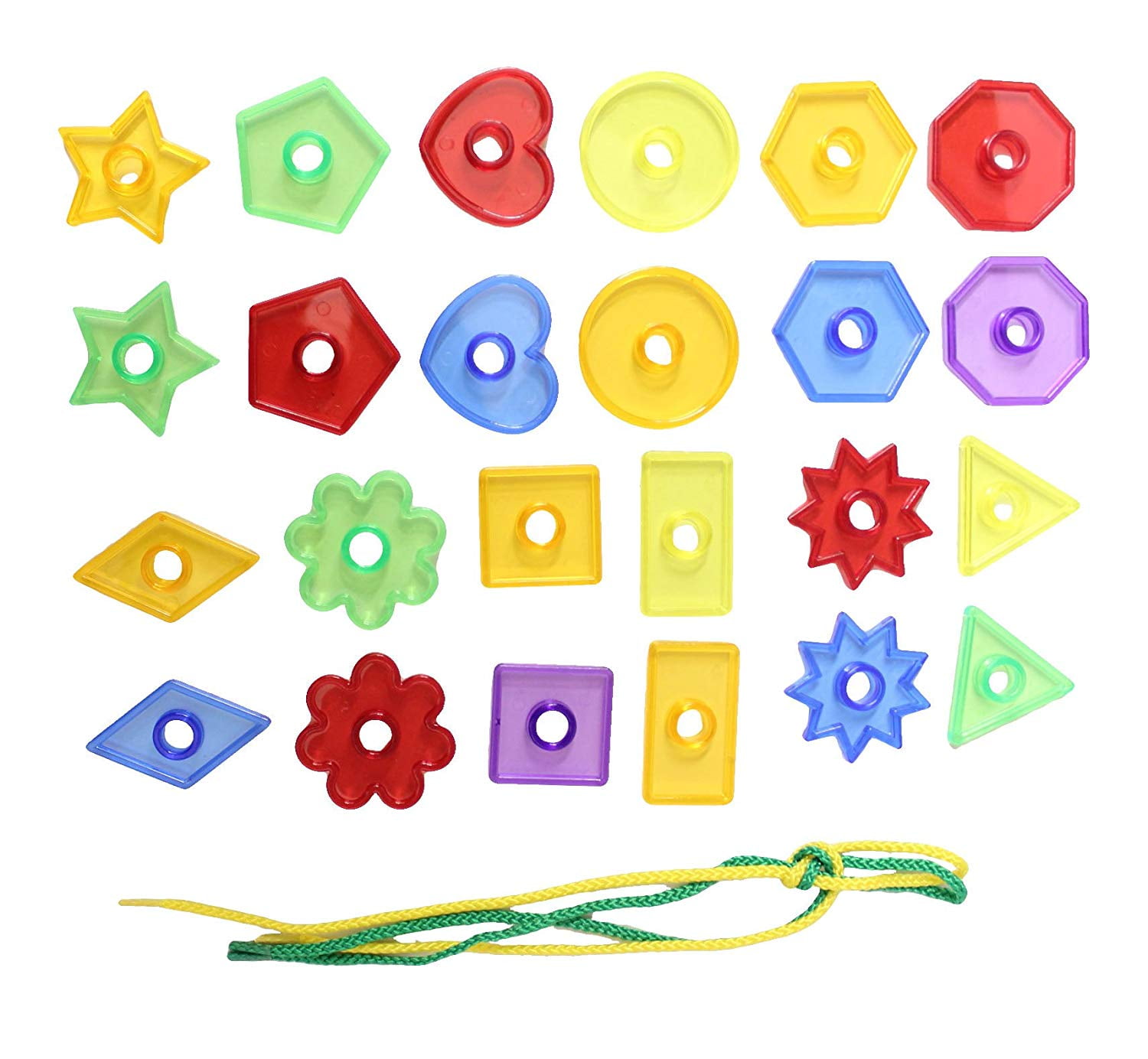 This set of 24 large colorful plastic buttons is perfect for children. These make perfect large math counters and are a great way to teach colors and shapes. This bag has an equal mix of 12 shapes! These are large shapes with a single large lacing hole. The hexagon, flower, and circle are 2", and the square is 1.5". Uses: Sort by color. Sort by shape. String similar beads with included lace. Use as math counters. Ask the child to "show me what 5 looks like". Children love dropping objects into containers. These buttons work perfectly for this. You could even cut a slit in a coffee can or similar lid! Use with a light table or box since they are transparent. Includes: You get 24 buttons. 2 of each of the 12 different shapes. Button size is 2". Shapes included: Square, heart, circle, scalloped circle, triangle, star, diamond, rectangle, pentagon, octagon, starburst, and hexagon. 2 laces