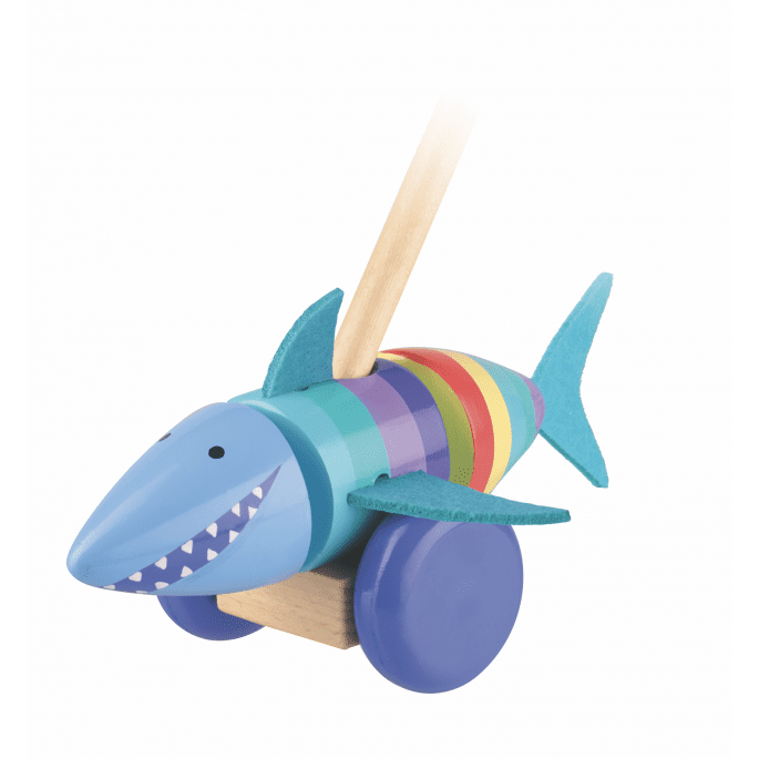 This colourful shark wooden push along is is the perfect traditional toy for toddlers When pushed along, the shark appears to be making a swimming motion, making this a really unique toy. Painted in bright colours, this toy will have your little one toddling along in no time with their swimming shark for company!Shark Push Along