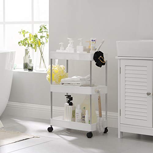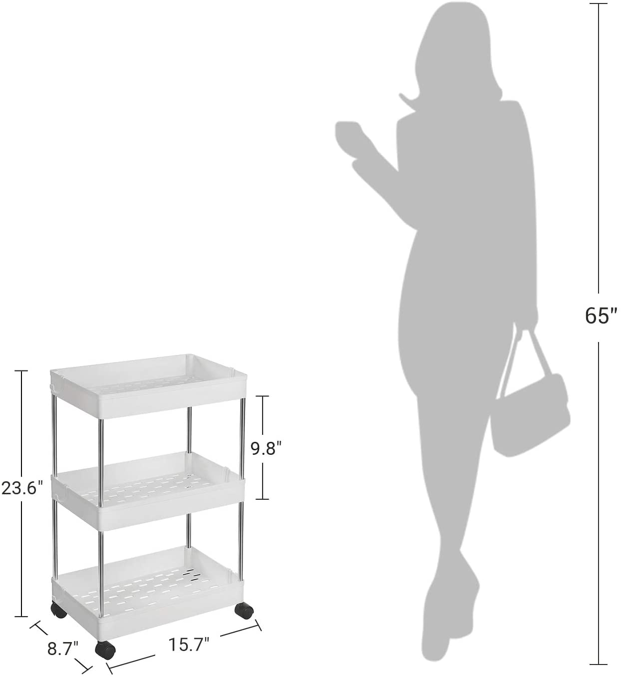 - Put an End to the Mess! Is chaos taking over your room? You only need 15.7” x 8.7” x 23.6” of space for this white storage cart with 3 shelves that helps you to sort all your bathroom products, kitchen utensils, or office documents