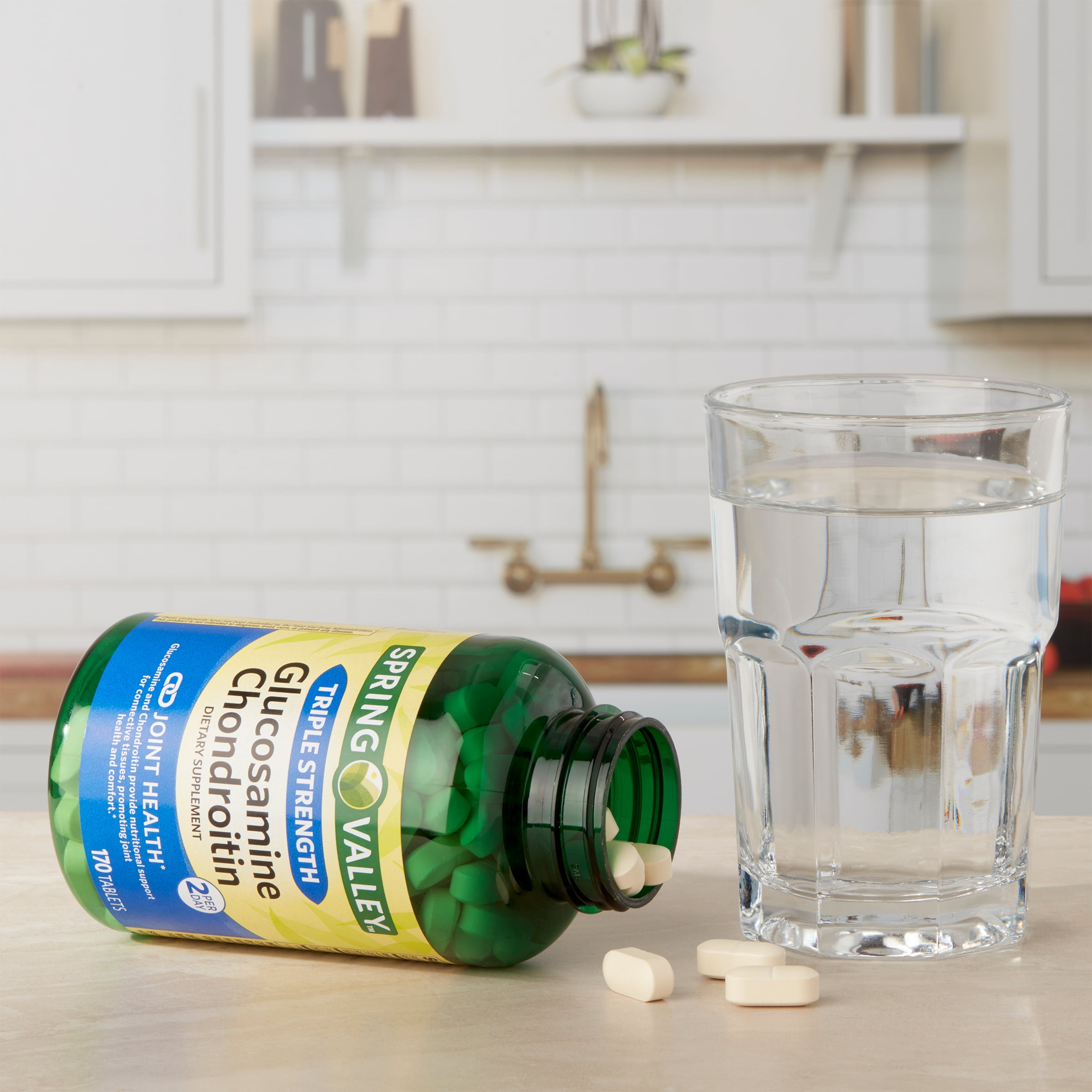Spring Valley Glucosamine Chondroitin Dietary Supplement Twin Pack is designed to provide joint health support. Glucosamine and chondroitin provide nutritional support for connective tissues, promoting joint health and comfort. The suggested adult dosage is two tablets daily, preferably with a meal. These tablets are free from gluten, artificial colors or flavors, sugars, and lactose. You can rest assured that Spring Valley Glucosamine Chondroitin Dietary Supplement Twin Pack is produced with strict quality guidelines and is backed by our quality guarantee.