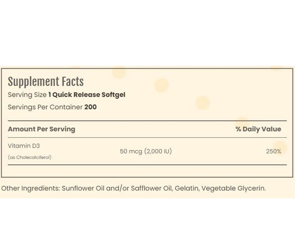 Bone & immune health.* Helps maintain healthy bones and teeth.* Supports a healthy immune system.* Supports proper neuromuscular function.* 1 per day. Gluten free. *These statements have not been evaluated by the Food and Drug Administration. This product is not intended to diagnose, treat, cure or prevent any disease.Bone & immune health.* Helps maintain healthy bones and teeth.* Supports a healthy immune system.* Supports proper neuromuscular function.* 1 per day. Gluten free. *These statements have not been evaluated by the Food and Drug Administration. This product is not intended to diagnose, treat, cure or prevent any disease.Ingredients: 1 Quick Release Softgel: Vitamin D3 (as Cholecalciferol) 2,000 IU (500% Daily Value); Safflower Oil; Gelatin; Vegetable Glycerin