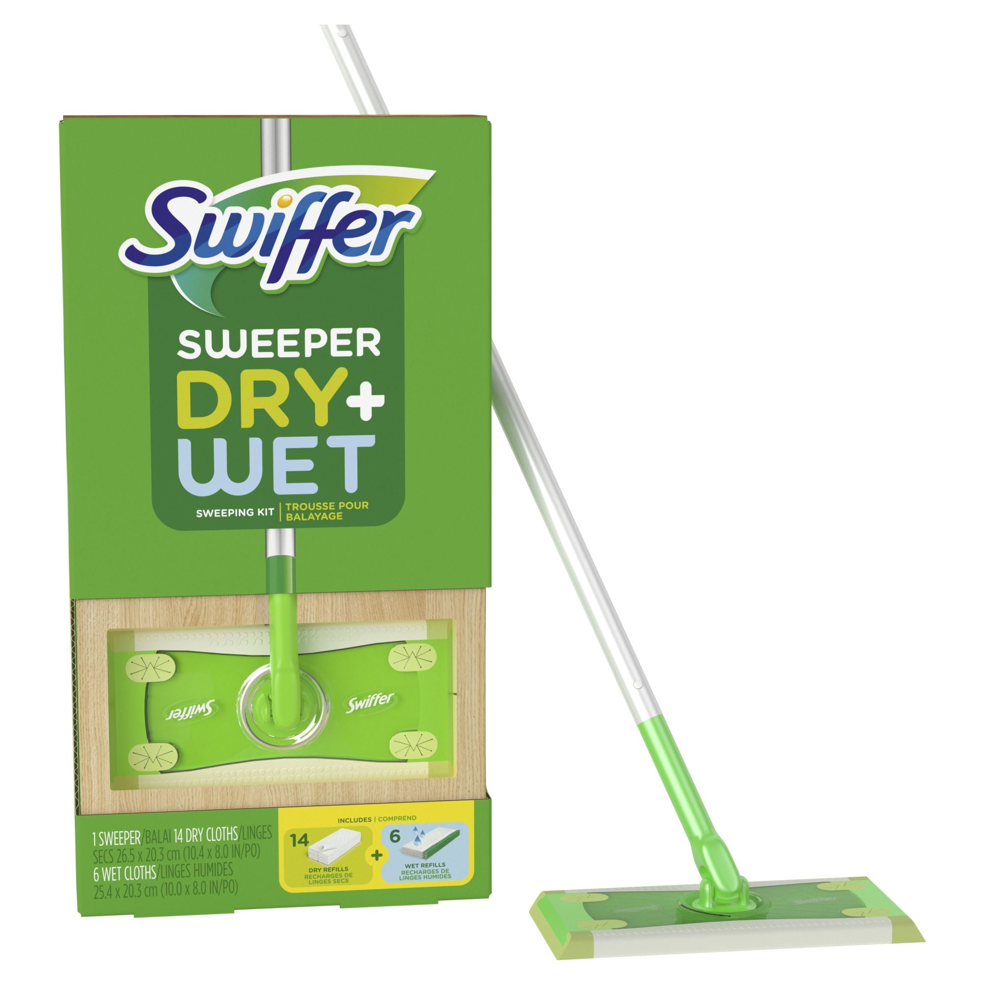 - Includes sweeper, (14) dry sweeping cloths, and (6) wet mop cleaning solution cloths