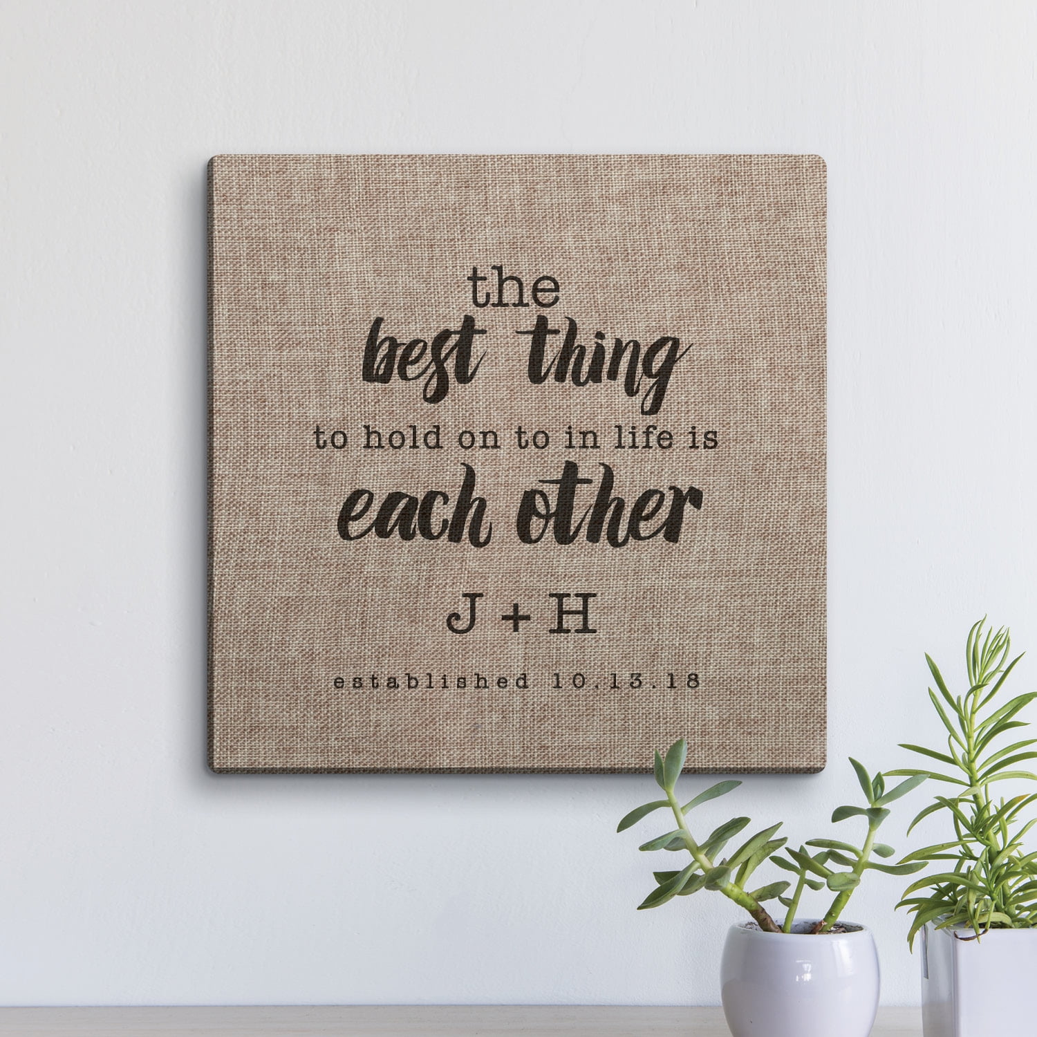 Our charming design features the phrase "The Best Thing To Hold On To In Life Is Each Other". We personalize the bottom with two initials and one line of text. Please note that the plus sign will automatically appear.