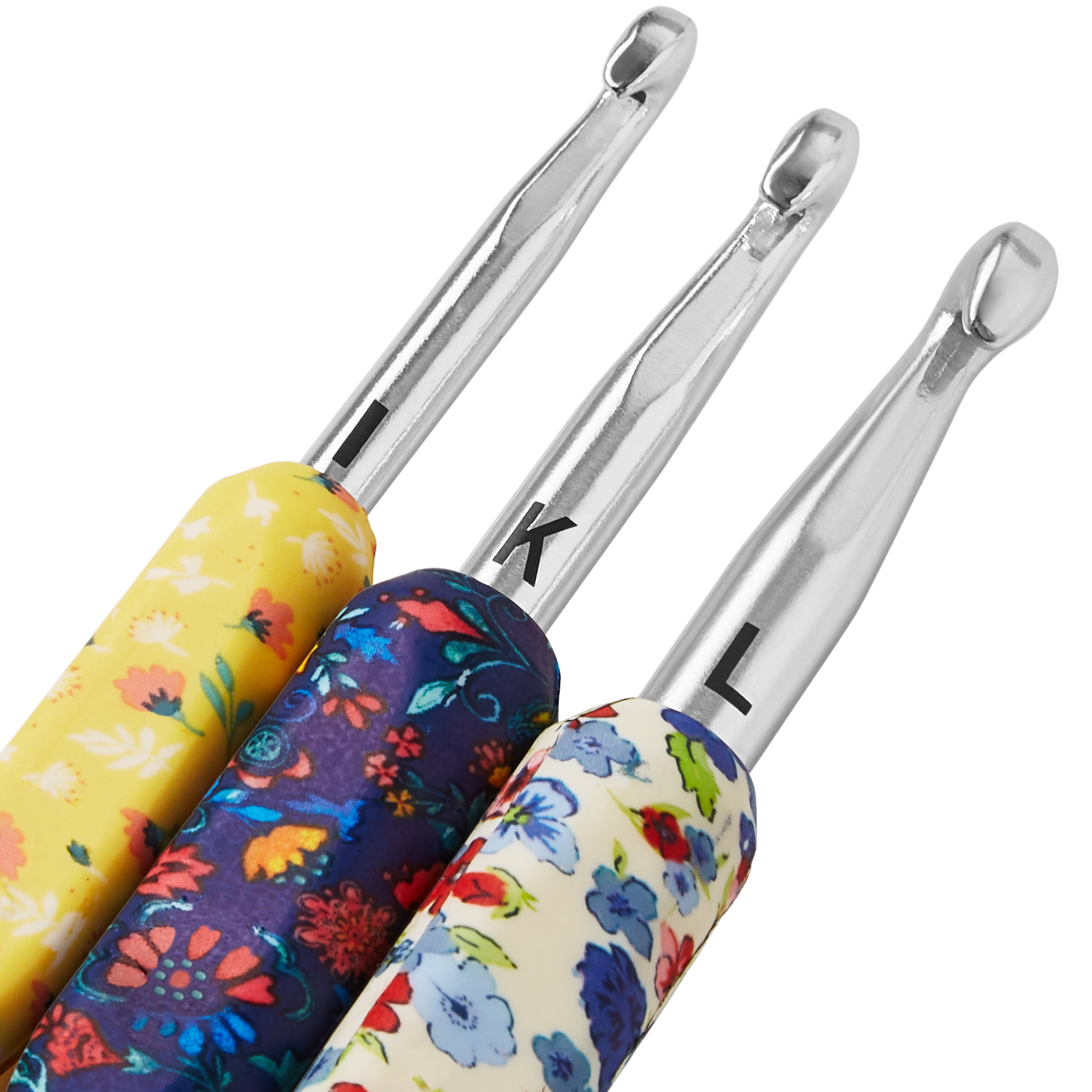 Extend your love for vintage-inspired style to your craft room with The Pioneer Woman 3-Piece Crochet Hooks Set. These crochet hooks in US sizes I, K, and L are able to accommodate a wide array of projects. Their sleek designs allow yarn to glide easily and prevents splitting of yarn and their easy-to-grip handles provide a firm, comfortable hold as you work. With one of Ree’s signature floral prints and coordinating colors on each hook, you’ll find that making beautiful works of art is a beautiful task in and of itself! Chain, moss stitch, double crochet, and more with The Pioneer Woman 3-Piece Crochet Hooks Set.