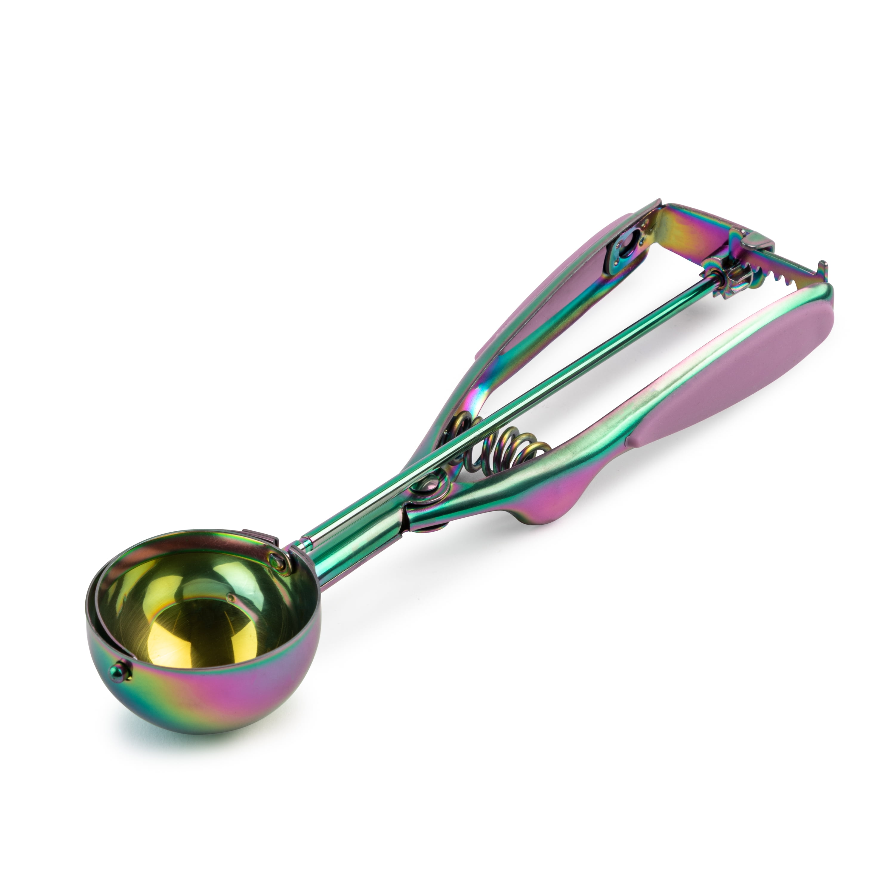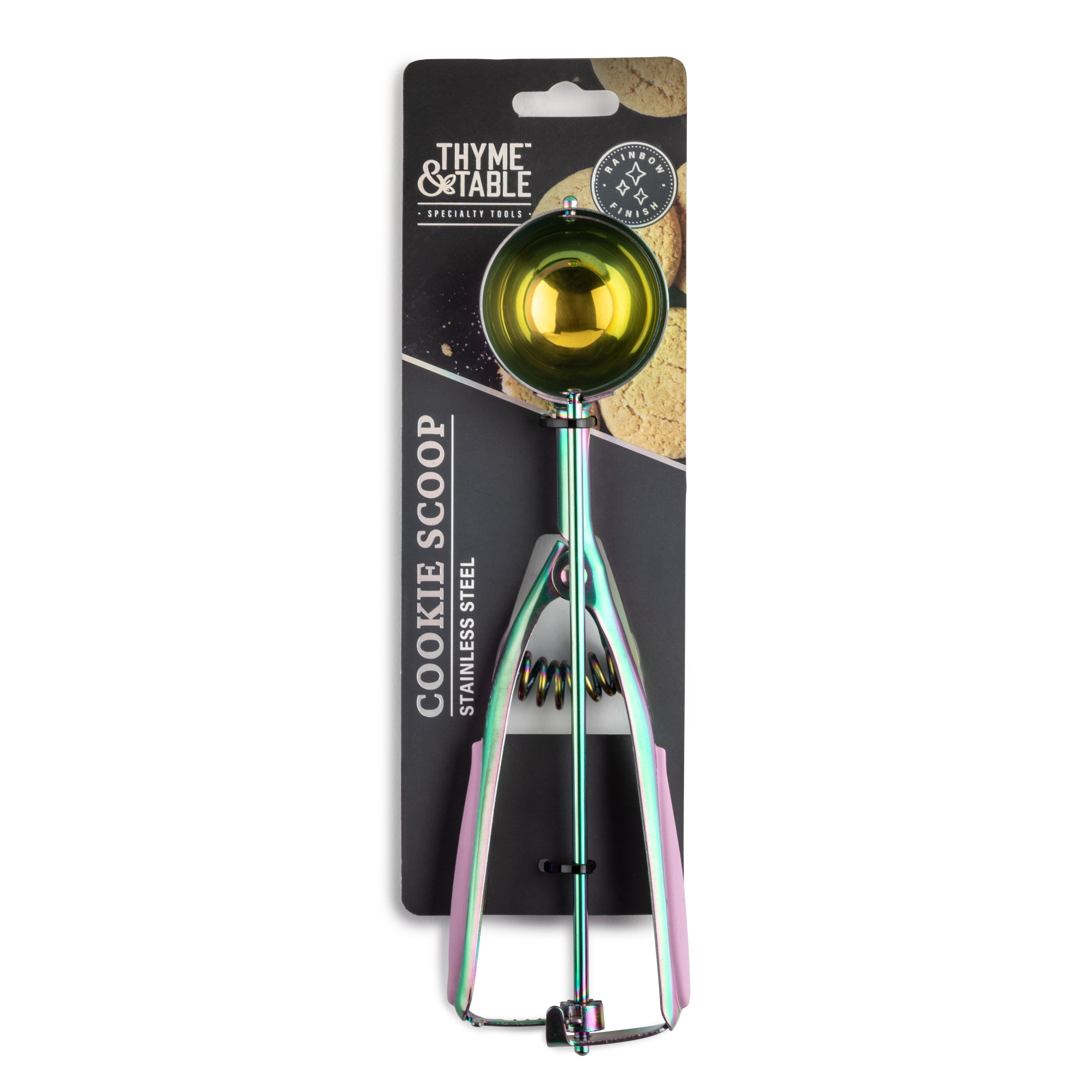 Thyme & Table Stainless Steel Cookie Scoop is a part of the Thyme & Table Speciality Tools Collection. The stainless steel cookie scoop has a rainbow finish, durable design, and comfort grip handle.