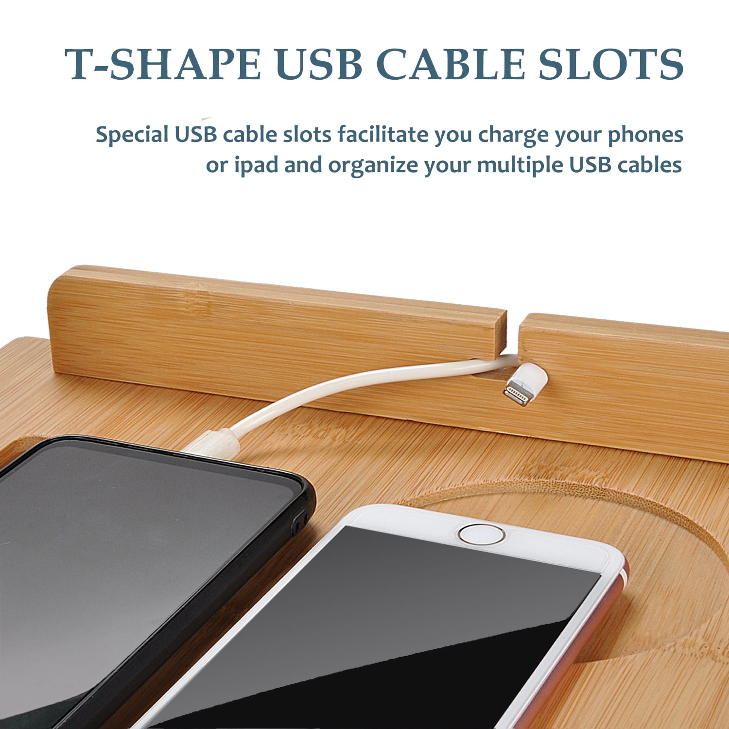 - CONVENIENT DESIGN: Special USB cable slots organize your cords to charge your phone, laptop or iPad. The wooden docking station has three side baffles that are detachable for more room to hold your things. It has a recessed design that securely holds a cup, pen, phone or tablet.