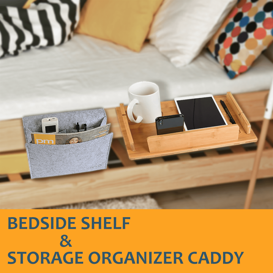 - VERSATILE THREE POCKET ORGANIZER CADDY: The free storage bag encourages organization and minimizes clutter on the bedside shelf table. It’s perfect for storing magazines, books, remote controls and note pads.