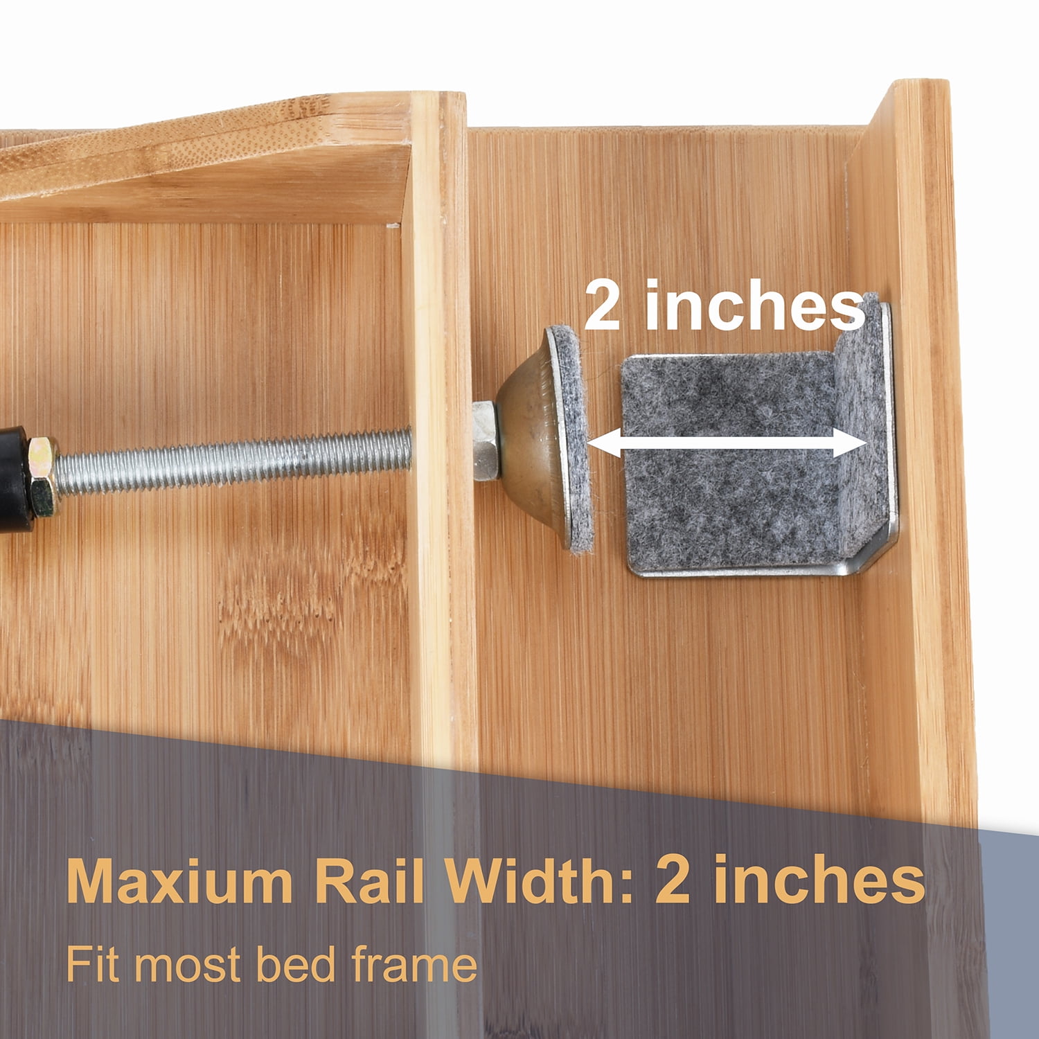 - EASY TO INSTALL: Place the tray rail over the bed frame, then turn the two knobs to tighten its strong clamp and level the tray. It works with bed frames up to two inches wide. A PEVA coating on the clamp protects your bed frame from damage.