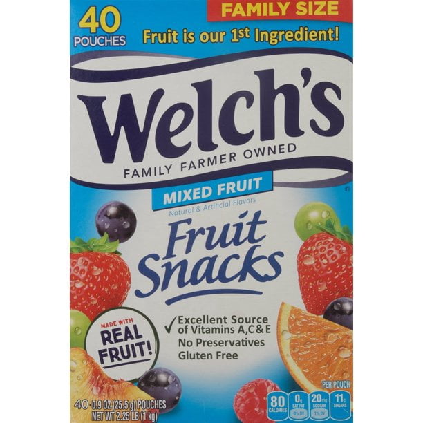 Welch’s Fruit Snacks Mixed Fruit. Family farmer owned.80 Calorie pouches. Fruit is our 1st ingredient. Natural & artificial flavors. Made with real fruit. DV per serving: 100% Vitamin C. 25% Vitamins A & E. Fat free. Gluten free. No preservatives.