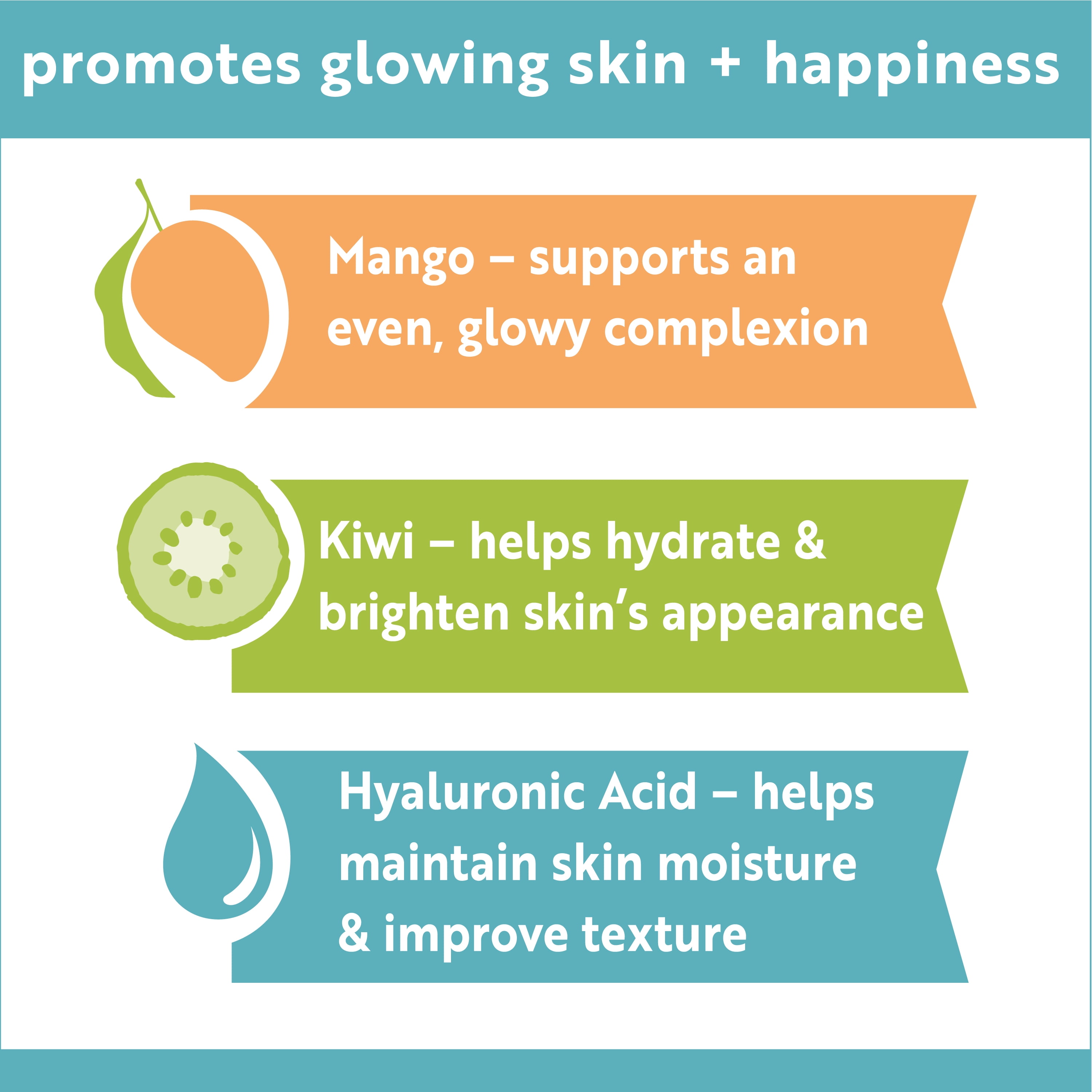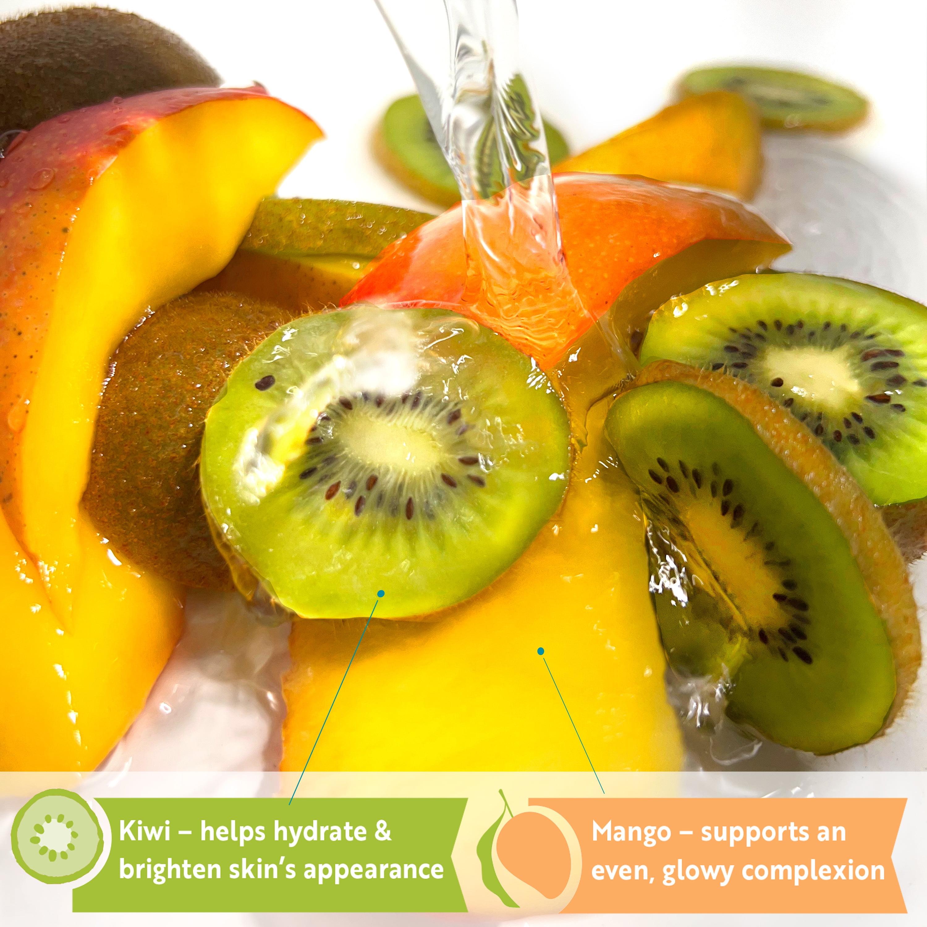 - Kiwi helps hydrate and brighten skin while mango helps support an even, glowy skin complexion