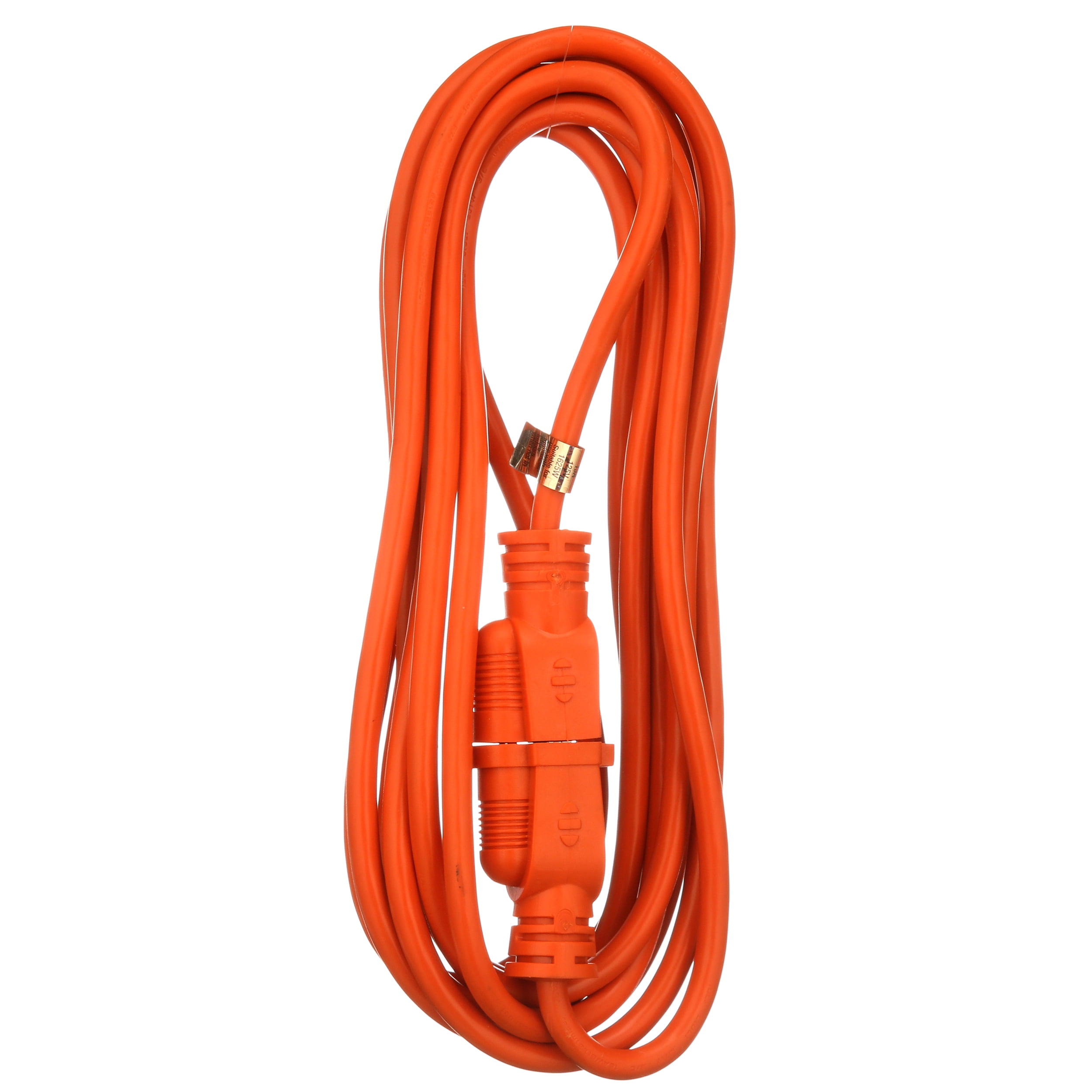 16/3 General Purpose Extension Cord, Orange, 15′. This vinyl outdoor extension cord is helpful all around the house. It has a vinyl jacket that resists moisture, abrasion and prolonged exposure to sunlight. Reinforced blades help prevent accidental bending or breakings. Molded plugs and heavy duty strain relief protects electrical connections resulting in longer cord life. Outer jacket won’t mark floors or walls. This cord is recommended for general indoor/outdoor use and is UL listed, cUL listed, ETL listed and meets OSHA requirements for outdoor use.