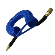 This recoil air hose is 1/4-Inch inner diameter by 25-Feet long. It is made of polyurethane material which makes this air hose resists kinking, abrasion, UV radiation, electricity, oil, chemicals and heat. 150 PSI working pressure. Flexible at -40 to +150 degree F. This air hose is also Installed 1/4" heavy duty industrial quick coupler and plug for convenient to contact air compressor and air tools. The bend restrictors reduce kinking and help to increase the life of the hose