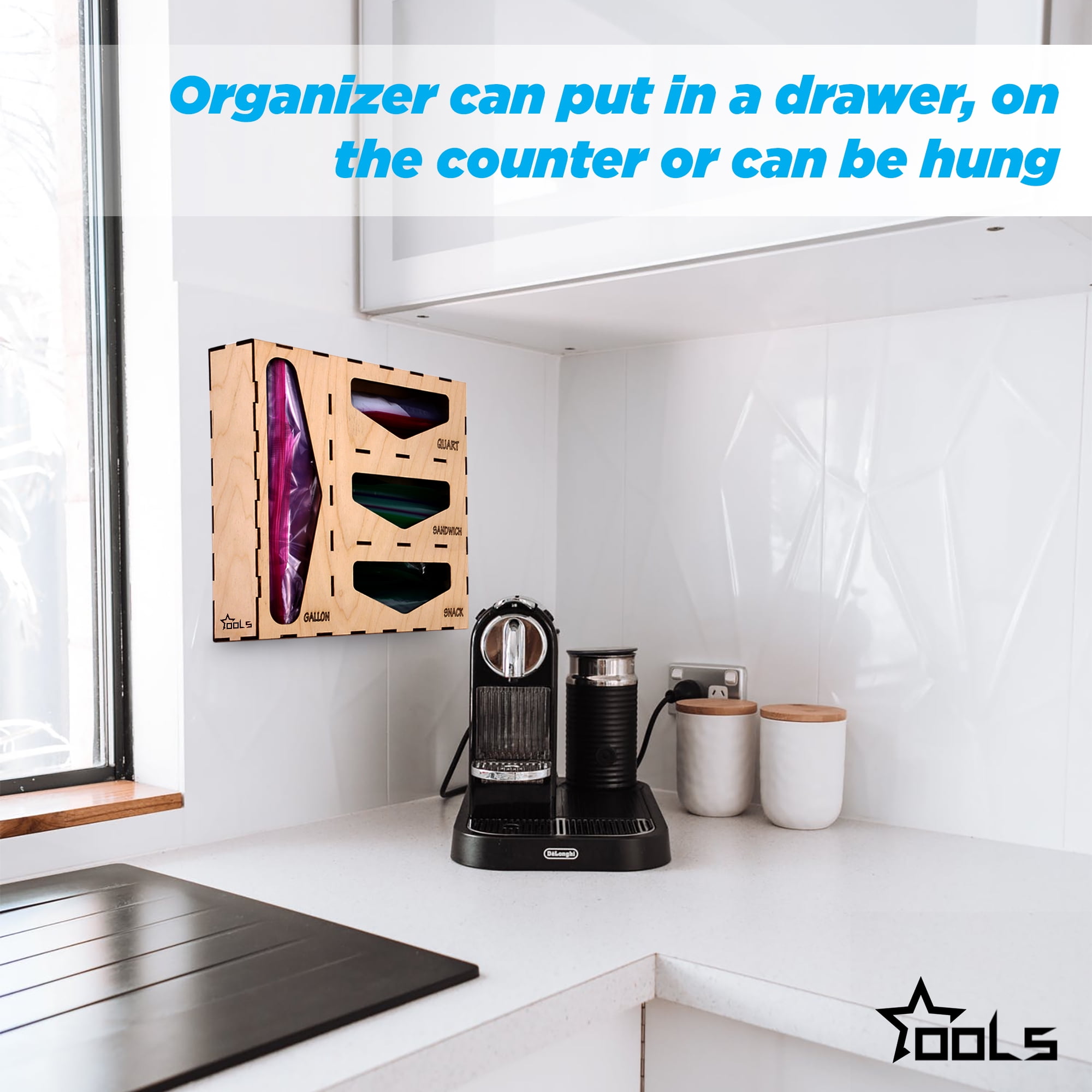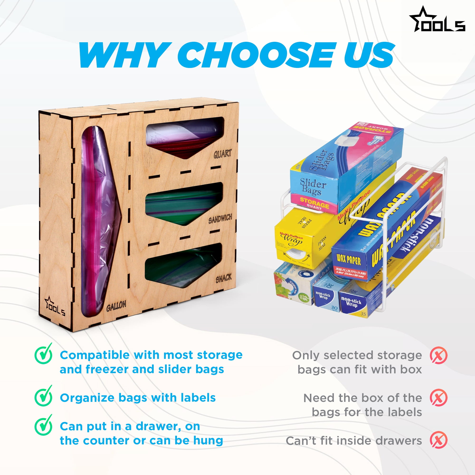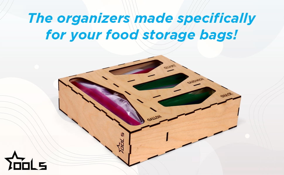 FINALLY! The Organizers Made Specifically For Your Food Storage Bags! No More Mismatched And Torn Up Broken Boxes. The Organizer Comes With 1 Section Of Gallon Box, 1 Section Of Quart Box, 1 Section Of Sandwich Box & 1 Snack Box. COMPATIBLE WITH MOST BRANDS: Compatible With Ziploc, Hefty, Glad, Up&up & Greatvalue Storage, Freezer And Slider Bags. Not Compatible With Quart Size Slider Bags. LASER ENGRAVING: Laser Engraved Letters That Will Last A Lifetime! No Rubbed Off Letters. No Peeling Labels. Due To The Nature Of Wood Material, Slight Color Variations At The Engraved Letters Is Normal. NO ASSEMBLING REQUIRED! Our Handcrafted Drawers Organizer Storage Boxes Come Fully Assembled. No Glue, No Hassle! EASY TO CLEAN: Simply Wipe Clean With Damp Cloth. Do Not Put In Dishwasher Or Microwave.Ziplock bag storage organizer–Kitchen Drawer Organizer Compatible With Zipl, Glad, Hefty For Gallon, Quart, Sandwich & Snack Variety Size Bags