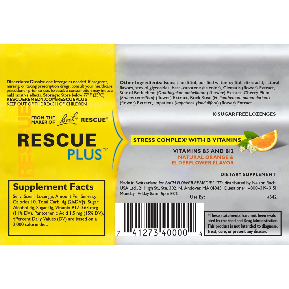 Bach Rescue Plus Stress Complex B Vitamin Lozenges, Orange and Elderflower, 10 Ct