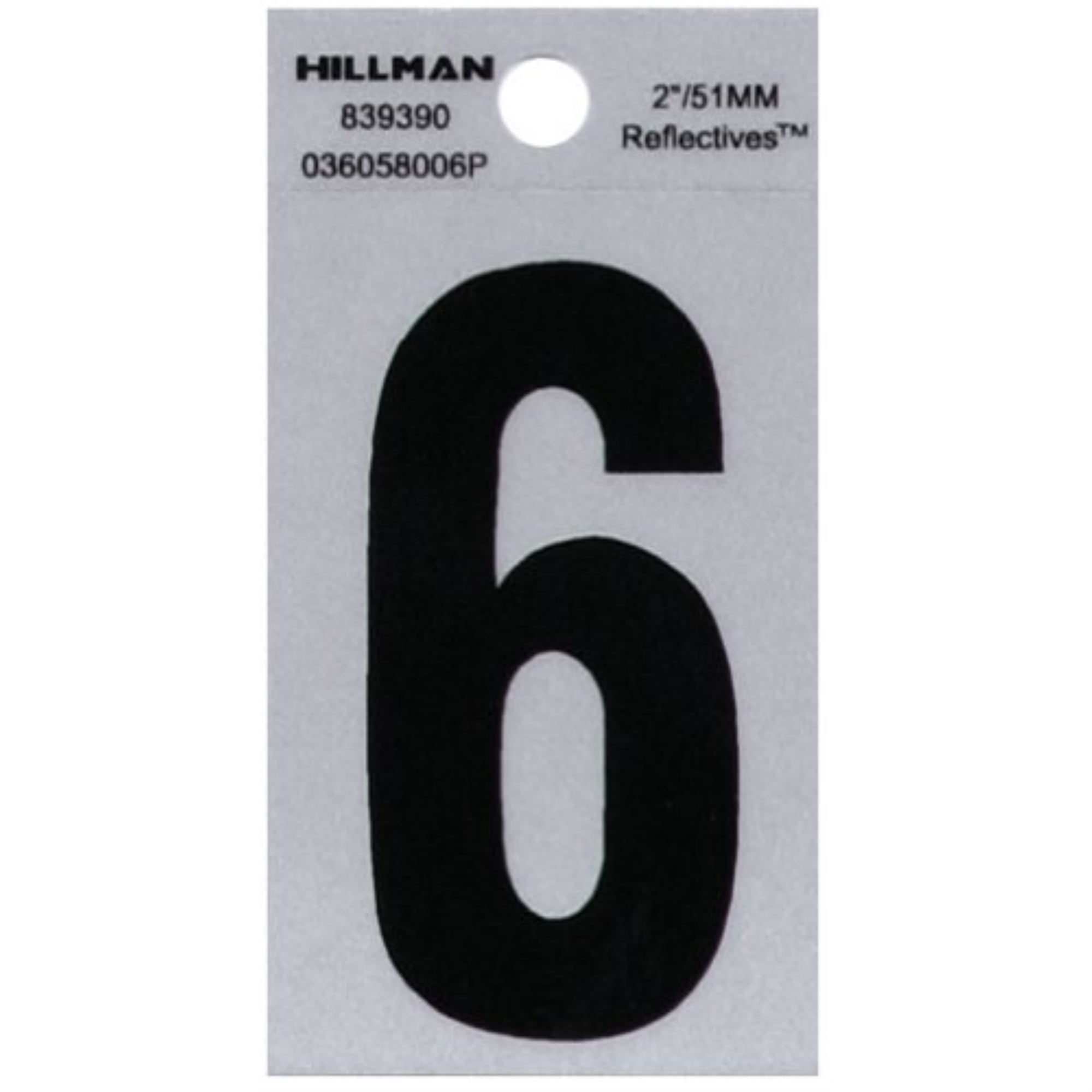 Hillman 839390 2" Black and Silver Reflective Poly-Film Adhesive Number 6 Product Description Simple and classic, these reflective numbers are perfect for use on a mailbox or your home. The durable vinyl construction stands up to weather. The reflective finish enhances visibility to ensure that visitors and emergency workers alike can find the address with ease. From the Manufacturer This is a square cut reflective number with a self adhesive back. The vinay lnumber are light weight and easily adher to most surfaces. Both substrates and weather resistant. Self-adhesive , Made of durable Mylar , Perfect for use on a house or mailbox , Reflective surface provides enhanced visibility , Display house numbers in a place that is easily visible from the street