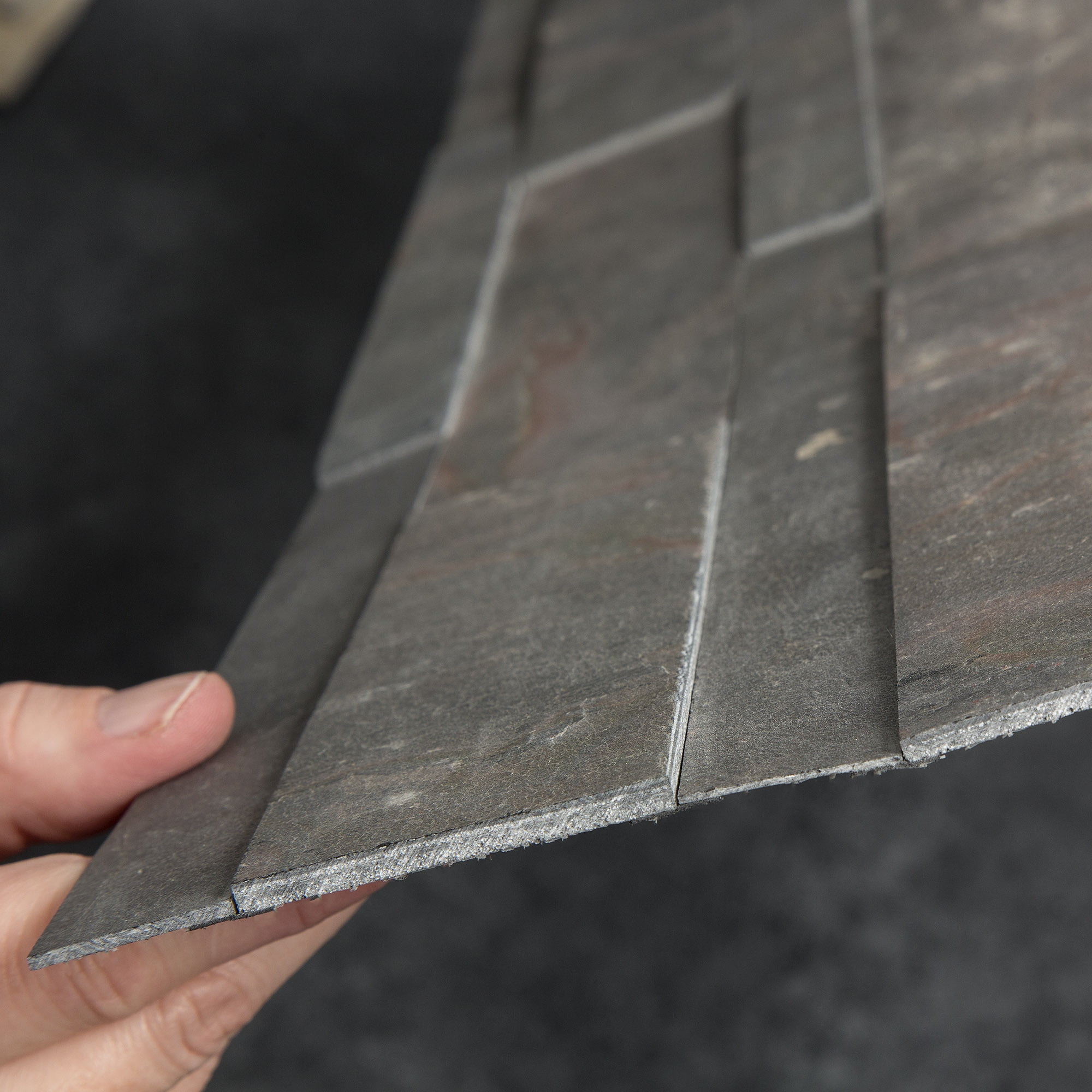 - Backsplash tiles are comprised of layers of real stone, engineered bonding resin, fiberglass, and an adhesive base