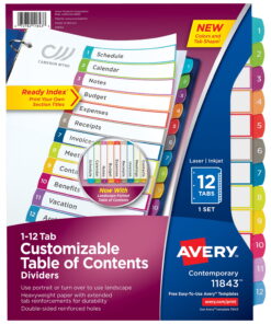 Avery 5 Tab Dividers, Customizable TOC, Multicolor, 1 Set (11816) 5 x Divider(s) – 1-5, Table of Contents – 1 Tab(s)/Set – 8.5′ Divider Width x 11′ Divider Length – 3 Hole Punched – Clear Plastic