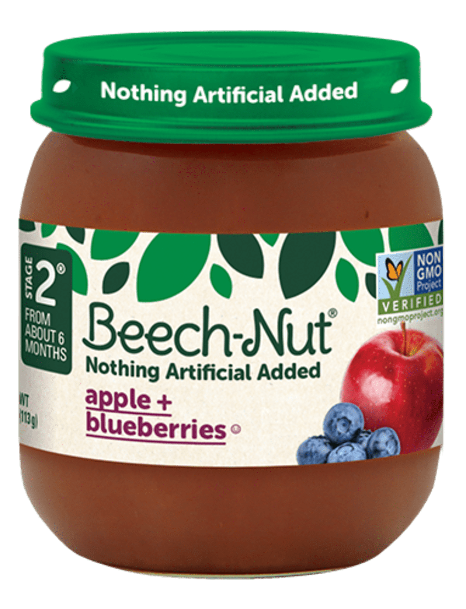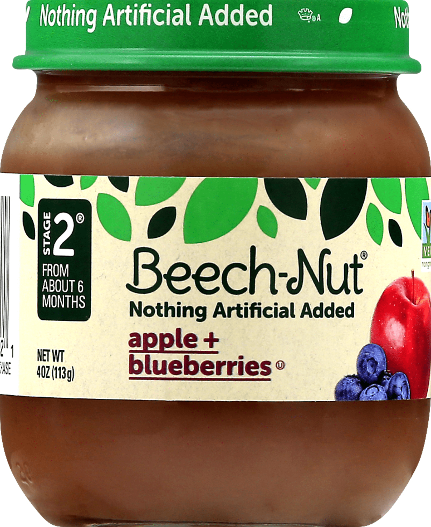 One of our most popular baby food combinations, this apple and blueberries puree is sure to please your 6-month-old baby. Beech-Nut apple & blueberries is Non-GMO Project verified with a smooth texture and nothing artificial added. This Stage 2 baby food is appropriate for babies around 6 months, when they are sitting upright. You can also mix this puree with infant cereal like Beech-Nut rice or oatmeal cereal to add more texture and essential nutrients like iron. All Beech-Nut baby food jars are vacuum-sealed for freshness. This jar can be stored in the refrigerator for up to 3 days after opening.