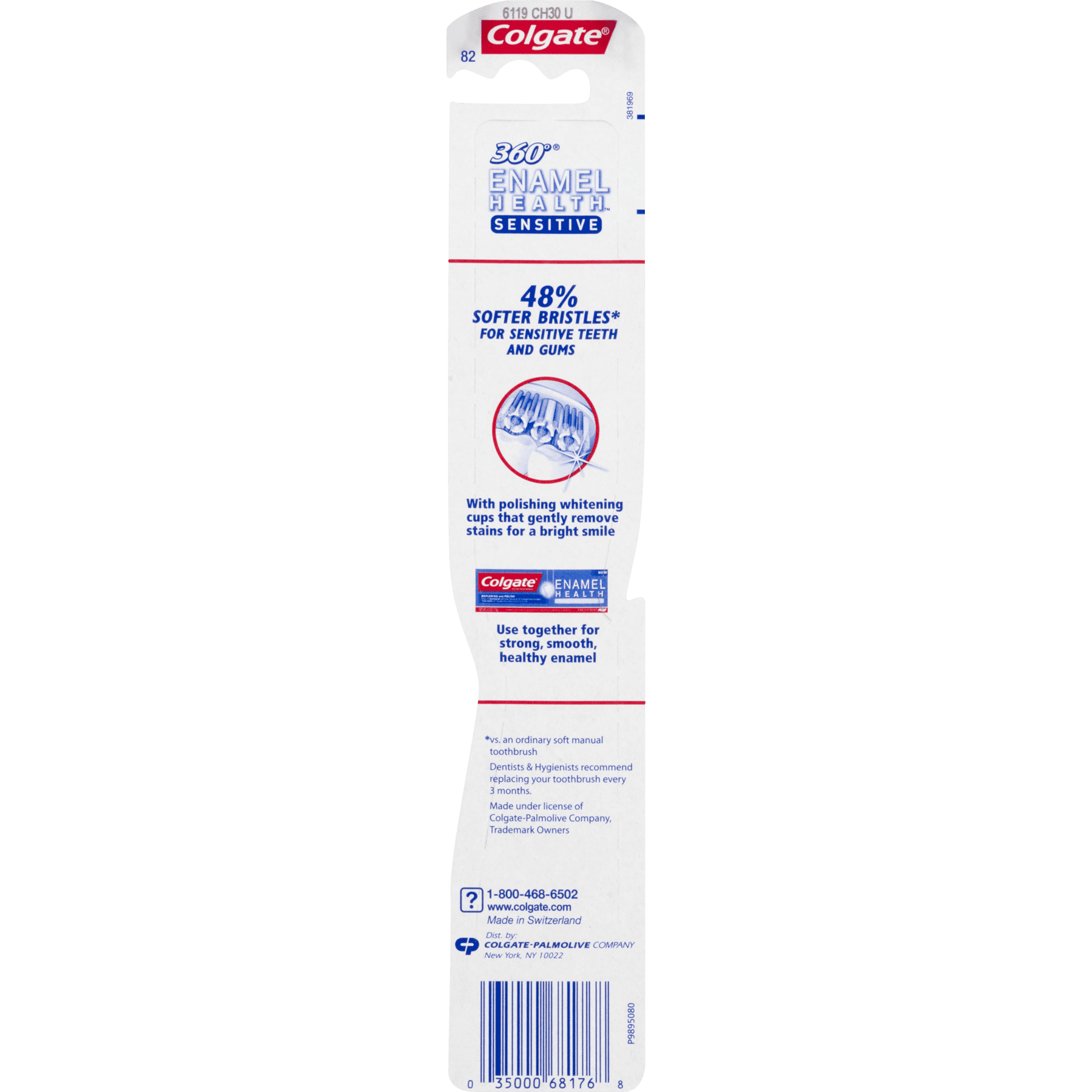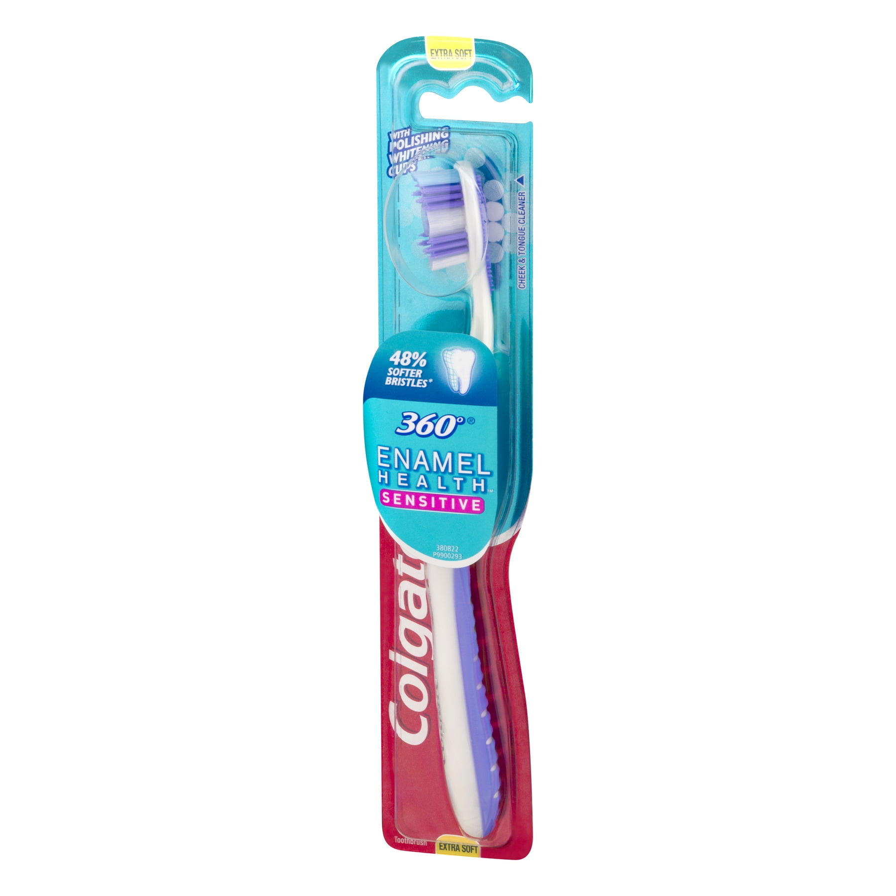 The Colgate 360⁰ Enamel Health Sensitive manual extra soft toothbrush has 48% softer bristles (vs. an ordinary soft manual toothbrush) to help protect enamel surfaces and gums. This extra soft toothbrush features a raised cleaning tip that helps get into hard-to-reach areas, polishing whitening cups that gently remove stains for a bright smile, and the unique cheek & tongue cleaner that helps remove odor-causing bacteria.