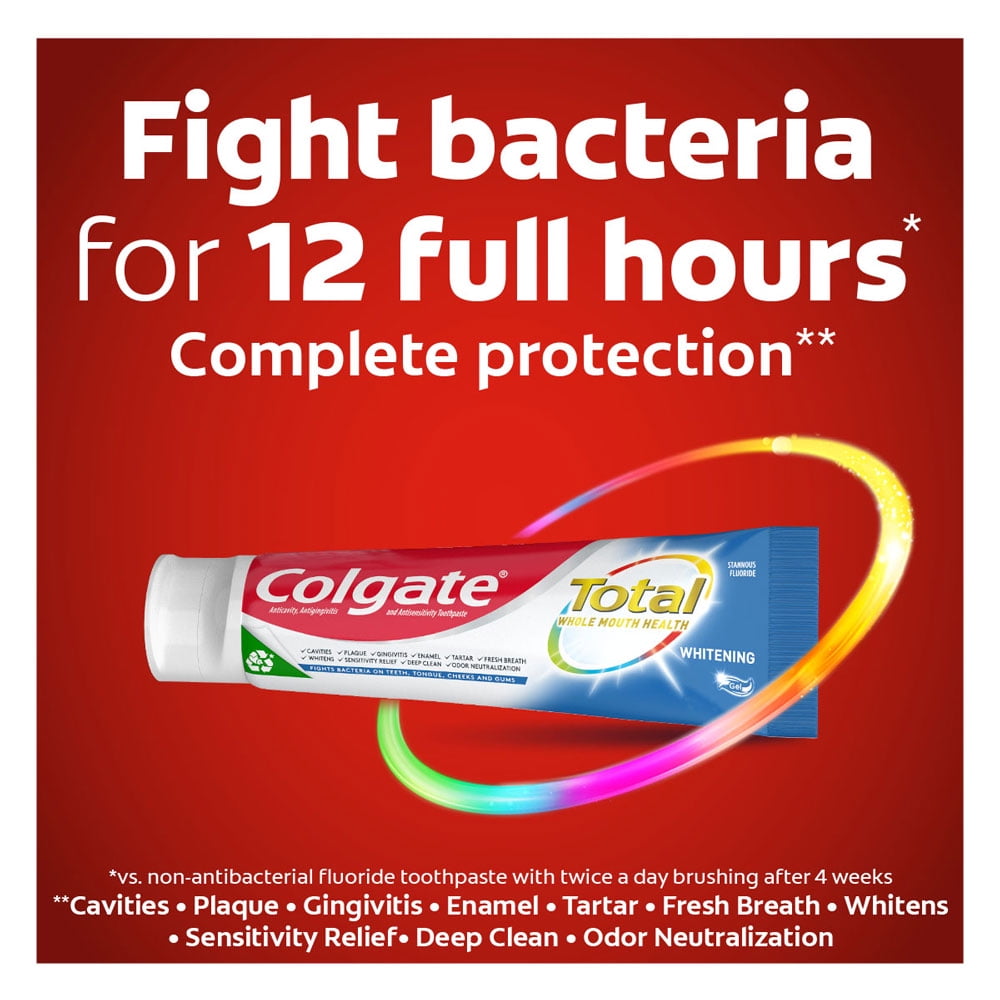 Colgate Total toothpaste is a whitening toothpaste and so much more. Want a healthier smile? Colgate Total not only whitens teeth but keeps breath fresh, provides sensitivity relief with continued use, and has clinically proven antibacterial protection for a healthier mouth.** Protect 100% of the mouth’s surfaces — teeth, tongue, cheeks and gums — with Colgate Total toothpaste. This teeth whitening toothpaste is also specially formulated with stannous fluoride and fights bacteria, helps prevent cavities and gingivitis, provides tartar control with regular brushing and strengthens enamel. A confident and attractive smile comes with bright white teeth and the health of your mouth. You can smile confidently when you use Colgate Total toothpaste.