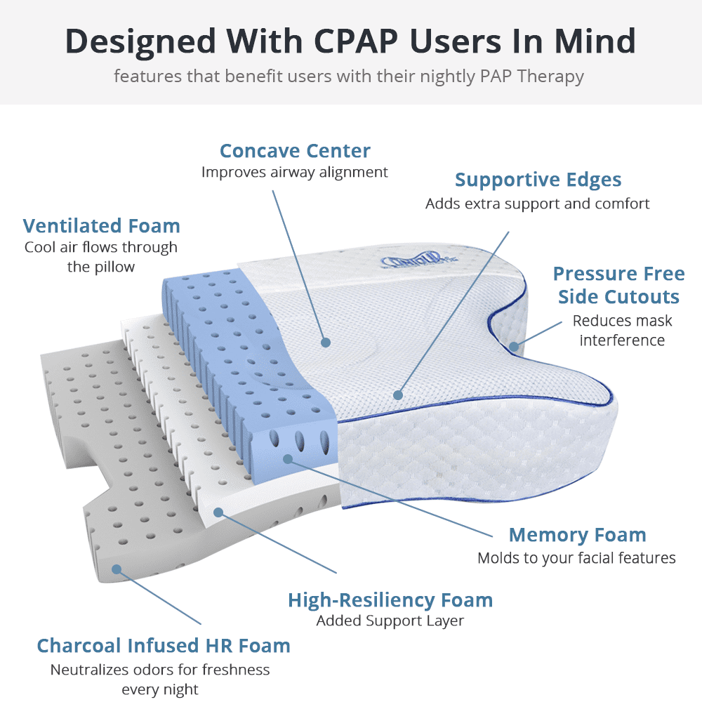 The Contour CPAP Max Pillow makes it easier to get a good night’s sleep when you’re wearing a CPAP mask. It has large cutouts on either side so you can sleep on your left or right side. This contour CPAP pillow helps the mask stay in place and reduces leaks. It includes a 3/4" insert that you can remove to adjust the height. This unit also reduces pressure on your face for fewer sores and bruises. The ventilation allows for better air circulation and humidity dissipation.