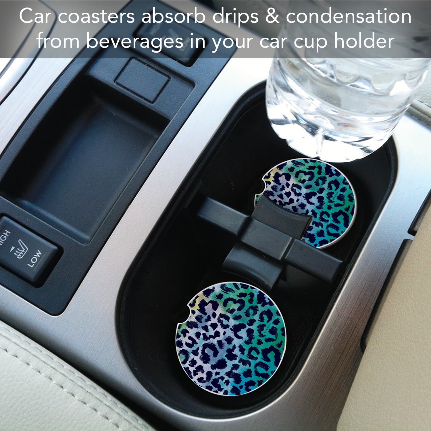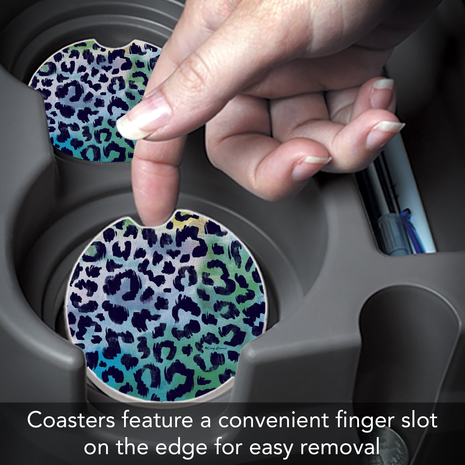 CounterArt Leopard Blues Absorbent Stone Car Coaster 1 Pack. Manufactured in the USA of absorbent stone to absorb excess condensation from beverages. Assists to keep your car’s cup holder clean and dry. Convenient notch on side of the car coaster, makes it easy to remove while detailing your car. Beautiful artwork adds distinction to your vehicle’s interior. Clean the coaster by wiping clean with damp cloth and mild detergent. Measures 2.6 inches round and fits most vehicle cup holders. Find that special design to complete your vehicle’s personality. Family and Friends will love receiving these long lasting, attractive Coasters for any occasion of the year.
