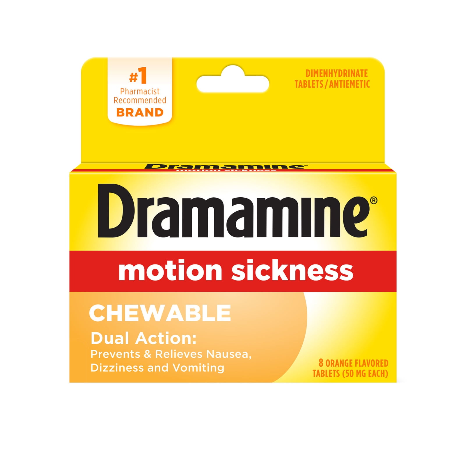 Get powerful, fast relief from motion sickness when you need it most from the Number One pharmacist-recommended brand! (1) Dramamine Motion Sickness Chewable tablets prevent and relieve nausea, dizziness and vomiting. It also treats symptoms on the spot with a convenient chewable orange flavored tablet. Don’t let motion sickness affect your plans – be prepared with Dramamine Chewable tablets. If you know you are going on an adventure that is likely to cause motion sickness, take Dramamine Chewable tablets BEFORE the trek. Also, be sure to drink plenty of water and avoid alcohol, which can increase dehydration and nausea. Take Dramamine and Take Control. For adults and children 2 and older. See packaging for dosing instructions and warnings. (1) Named by Pharmacy Times and U.S. News & World Report as Number One Pharmacist Recommended-Brand for 2020 Motion Sickness Remedies Category
