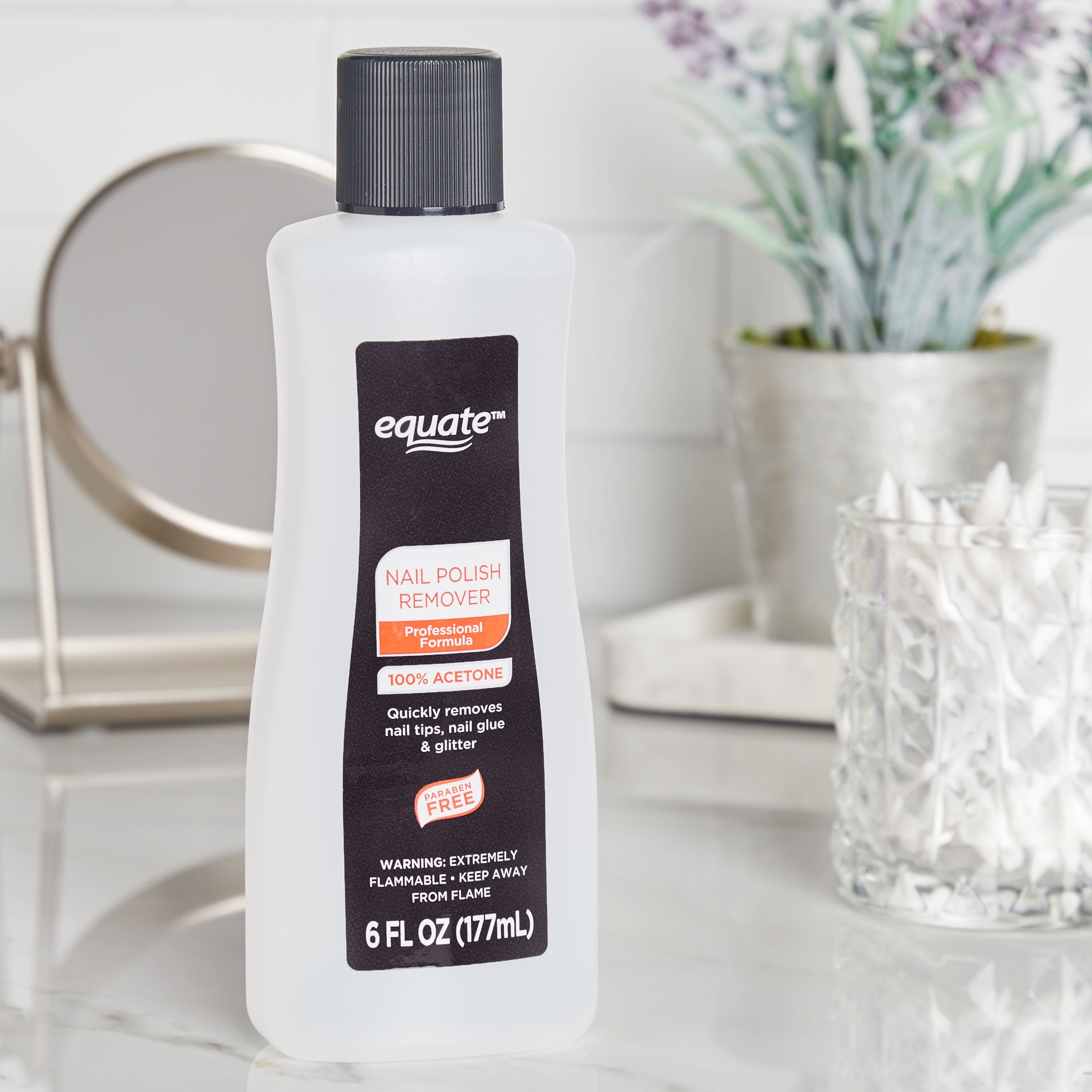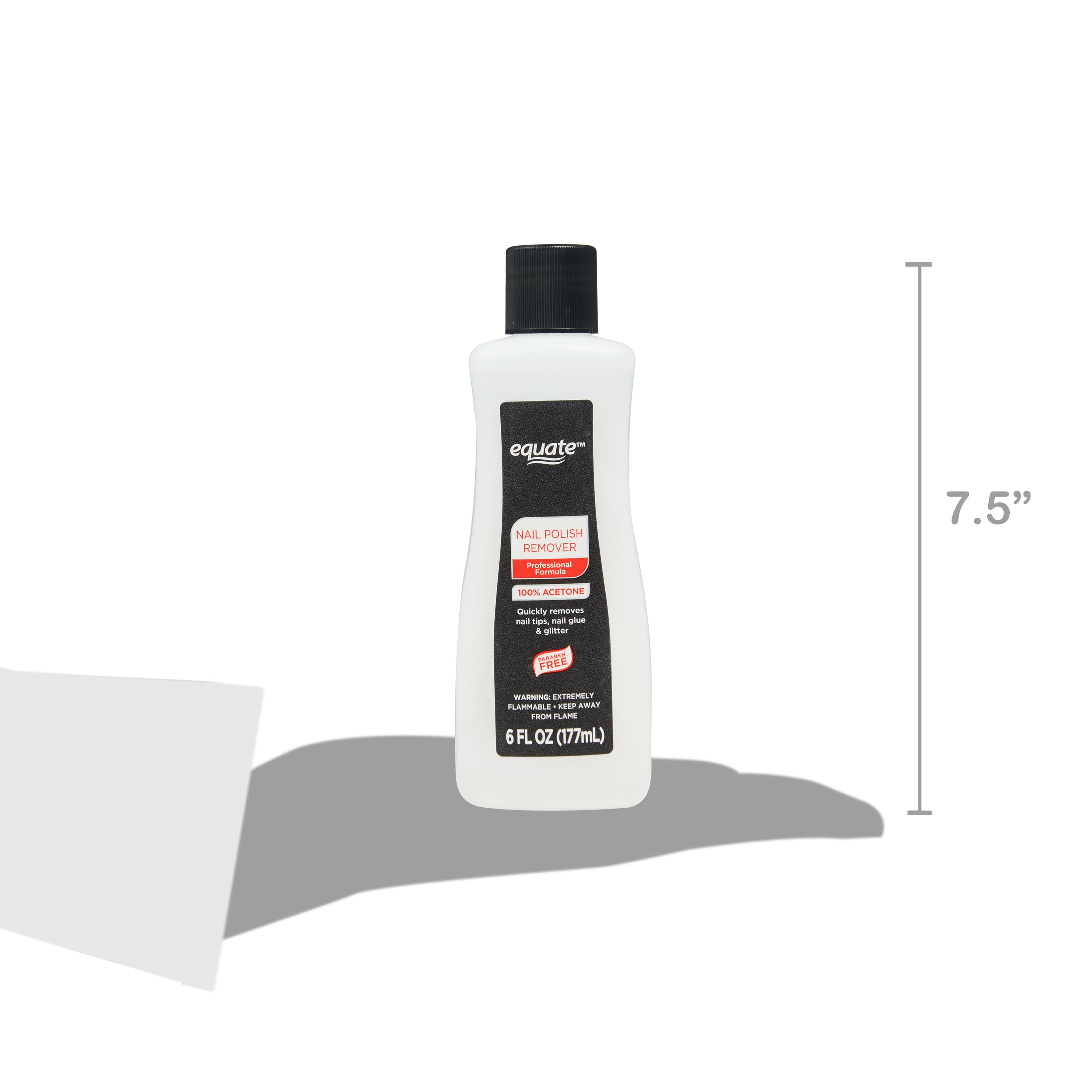 Equate Nail Polish Remover reveals the beauty of your natural nails and gets them ready for a mani/pedi makeover. It features a professional formula that effectively removes polish from your nails in a snap. The paraben-free remover in this 6-fluid ounce bottle makes quick work of regular polish and glitter polish alike! The 100% acetone formula also helps dissolve stubborn nail glue and nail tips. Choose Equate Nail Polish Remover to enjoy professional nail salon results at home.