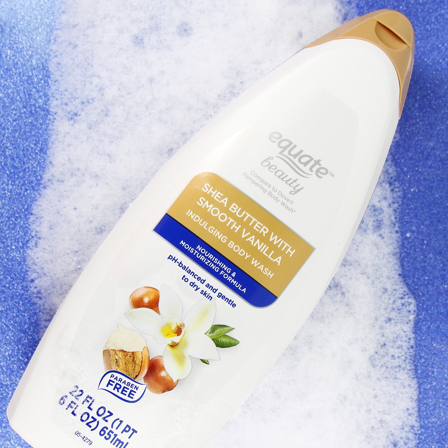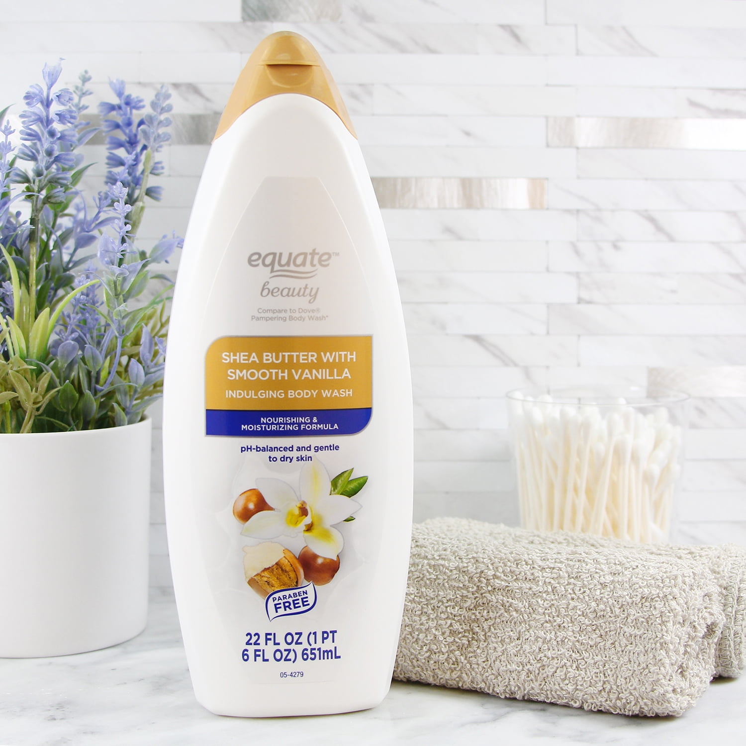 Equate Beauty Body Wash With Shea Butter with Warm Vanilla, 22 fl oz. Nourishes your skin and senses with shea butter and warm vanilla. This Shea Butter wash is paraben free and pH-balanced formula, which makes it a great body wash for all skin types. This proprietary blend of moisturizing ingredients is proven to work with your skin to nourish it, so it can maintain and create new moisture. For best results, squeeze this nourishing body wash into your hand or onto a shower pouf and work it into a rich lather. Massage it over your skin, taking time to allow the nourishing shea butter and warm vanilla to awaken your senses. Rinse off, revealing soft and smooth skin.