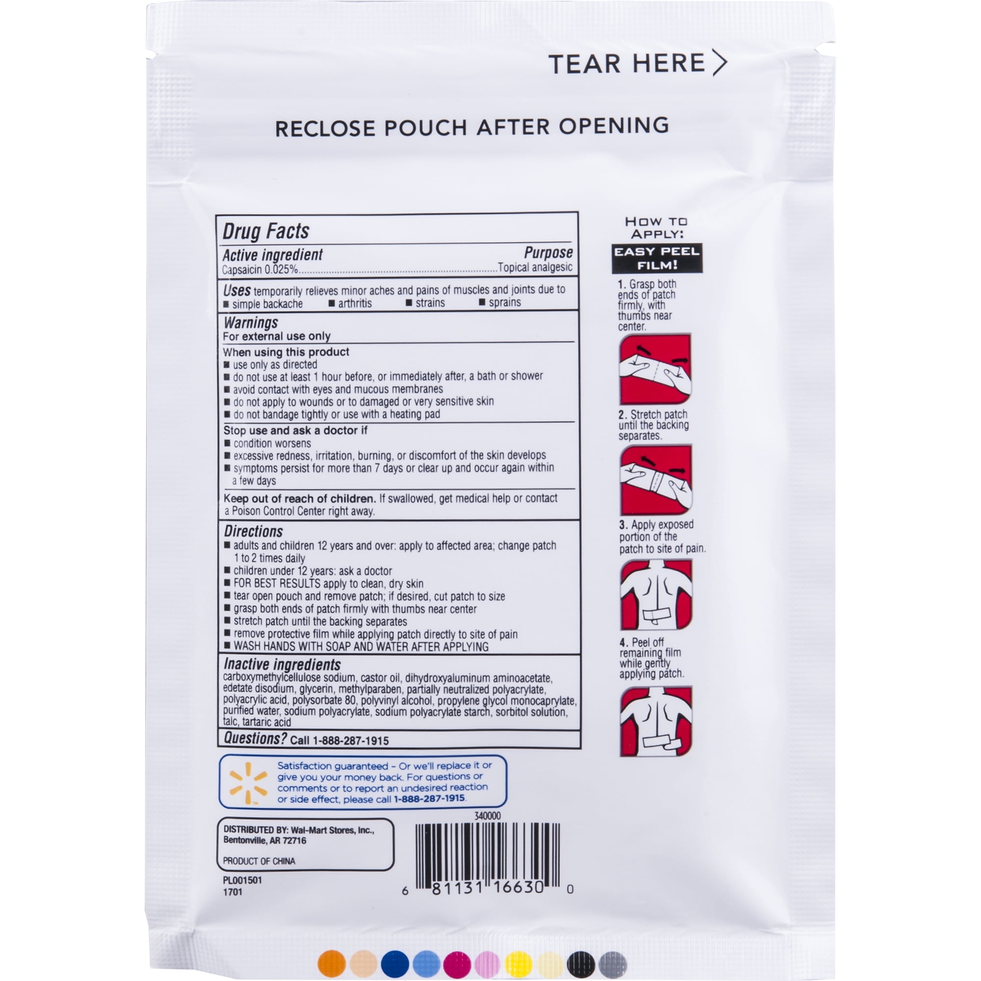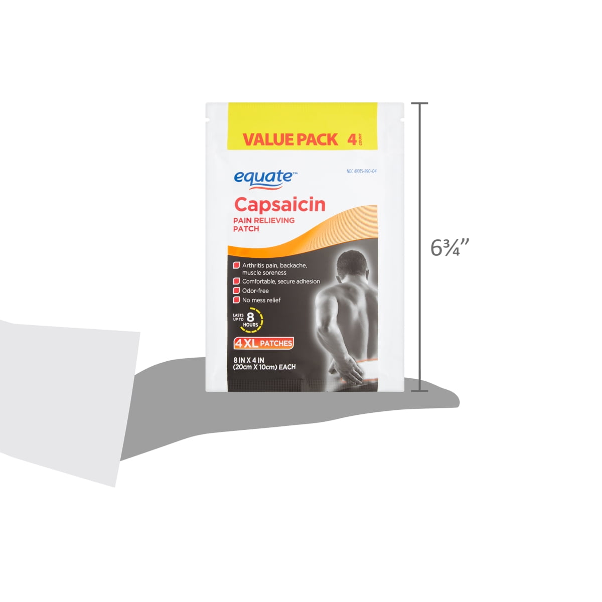 Say goodbye to back pain and muscle soreness with our Equate Capsaicin Pain-relieving Patch, XL. Are constant aches and pains getting in the way of your day? Get rid of them simply and safely with our capsaicin Pain-relieving patch. Capsaicin is a topical analgesic that gives chili peppers their heat, but it is used in this convenient patch to dull pain-sensing nerves in the body. The extra-large size makes it easy to soothe severe soreness or bigger back pain problems. Our easy peel film also makes this patch super simple to apply. Just grasp both ends of the patch firmly with your thumb near the center, stretch the patch until the backing separates, apply the exposed portion of the patch to the pain site, and peel off the remaining film while gently applying the patch. With 8 hours of soothing relief and four patches per value-sized box, you can rest assured your pain won’t bother you day or night. Put pain in its place with the Equate Capsaicin Pain-relieving Patch, XL.