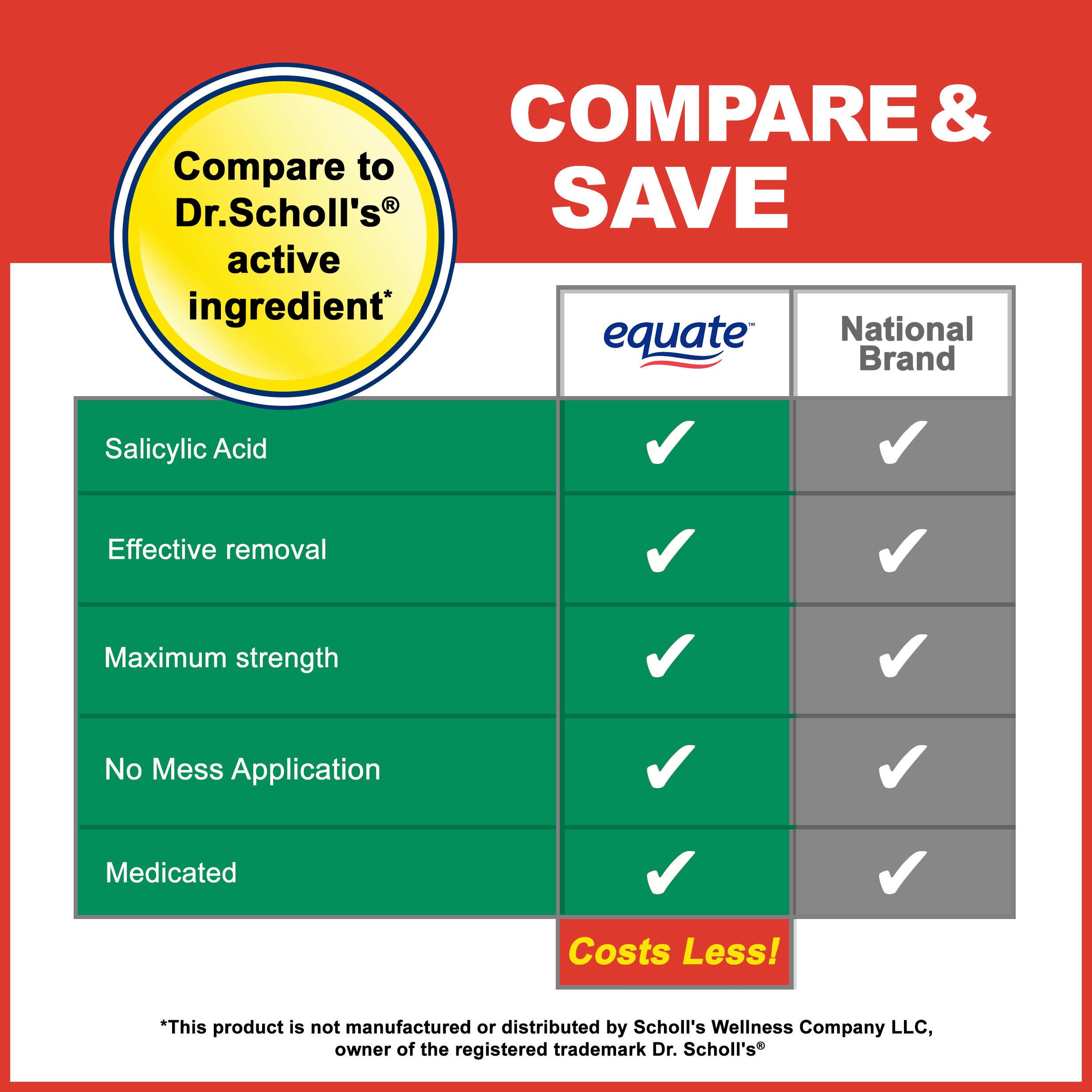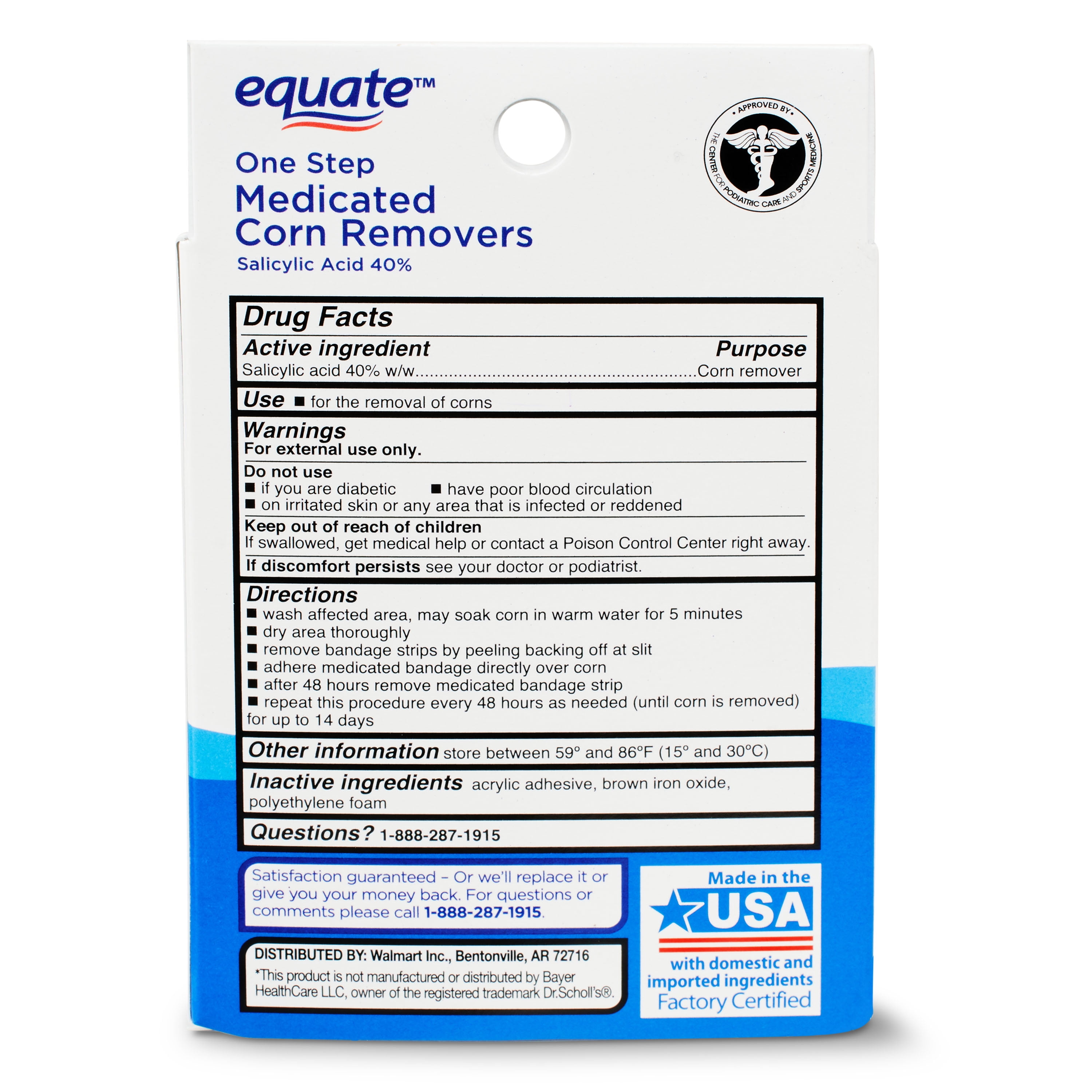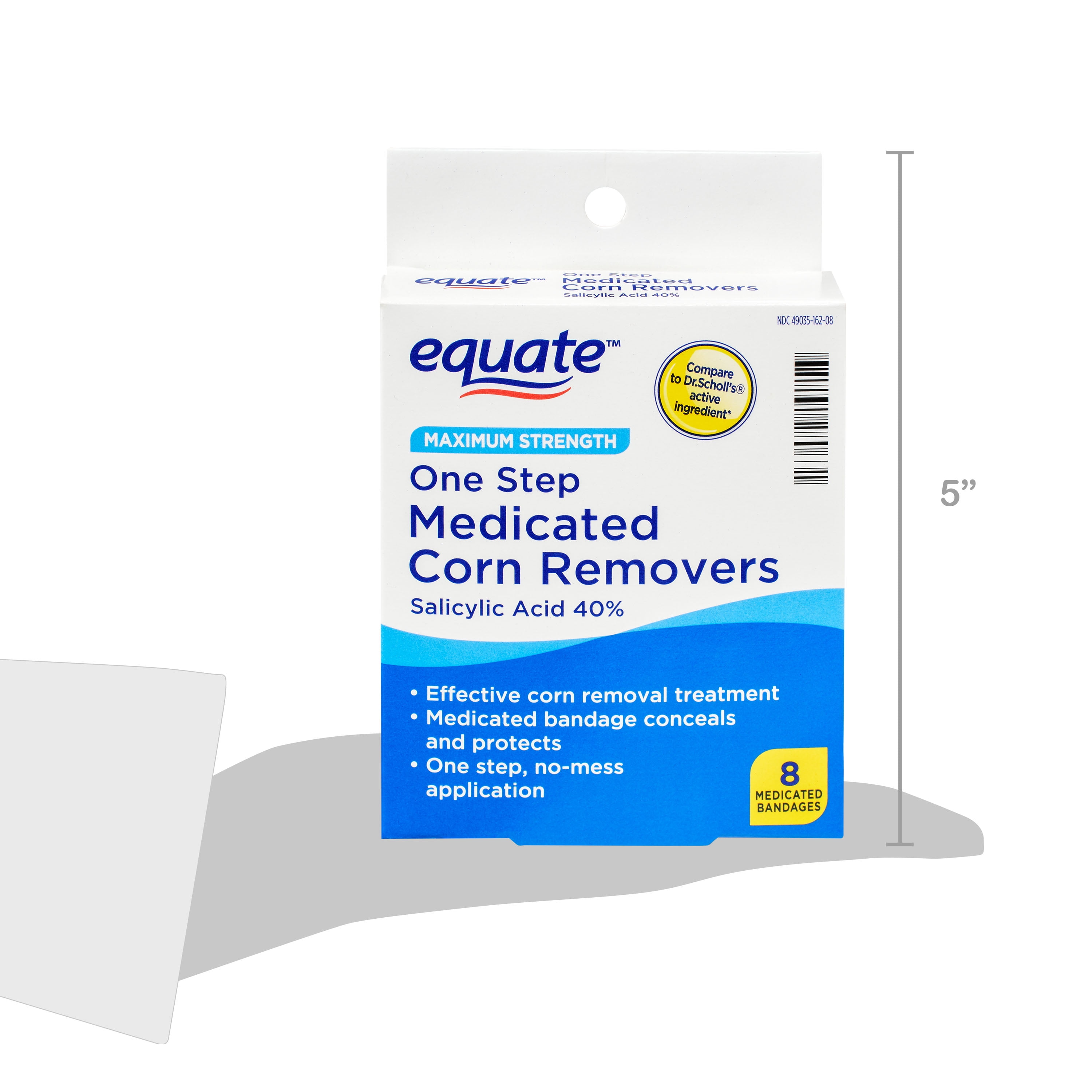 Take care of your feet with Equate Maximum Strength One Step Medicated Corn Removers. This effective corn removal treatment comes with eight medicated bandages that conceal, protect and remove your corns. With one step, no-mess application, these bandages are easy to use. Simply wash the affected area, dry thoroughly and apply the medicated bandage directly over the corn. Repeat this procedure every 48 hours as needed until the corn is removed. Get the relief you need with Equate Maximum Strength One Step Medicated Corn Removers. Making the right health decisions can be challenging. With a complete range of products and simple solutions, Equate allows you to take care of your family with confidence.