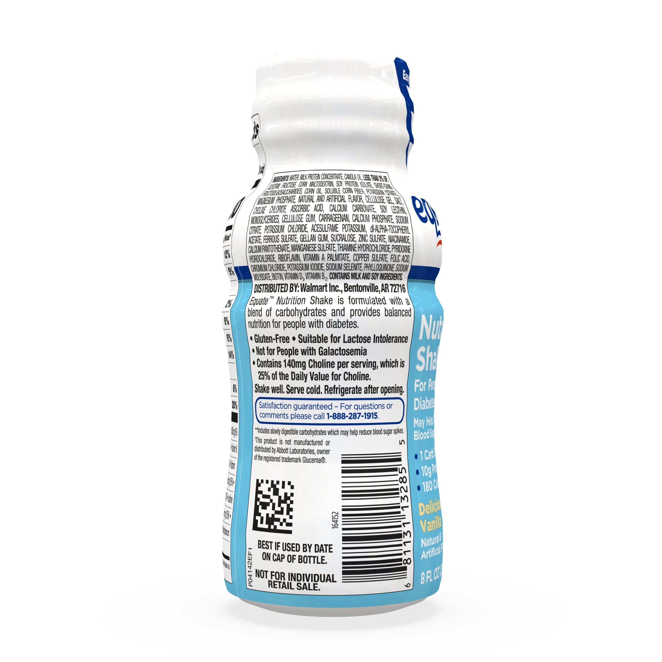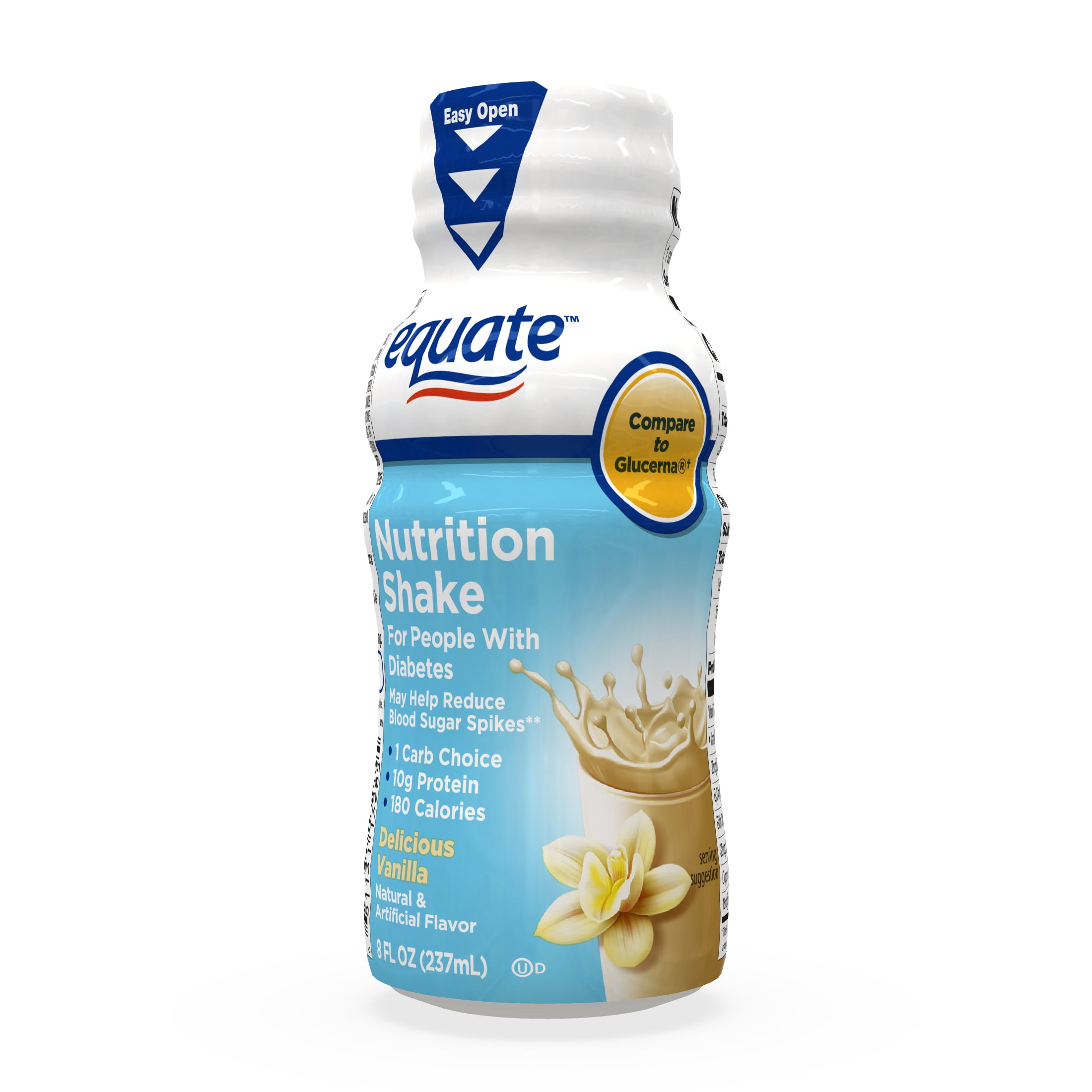 Vanilla Nutrition Shake for People with Diabetes is formulated with a blend of carbohydrates and provides balanced nutrition for people with diabetes. It may help reduce blood sugar spikes.* With 25 vitamins and minerals, 10 grams of protein and 16 grams of total carbohydrates, Nutrition Shake is gluten-free and suitable for those with lactose intolerance. *Includes slowly digestible carbohydrates which may help reduce blood sugar spikes. Compare to Glucerna®, a registered trademark of Abbott Laboratories.Equate Nutritional Shake for People with Diabetes, Vanilla, 8 fl oz, 6 Count: