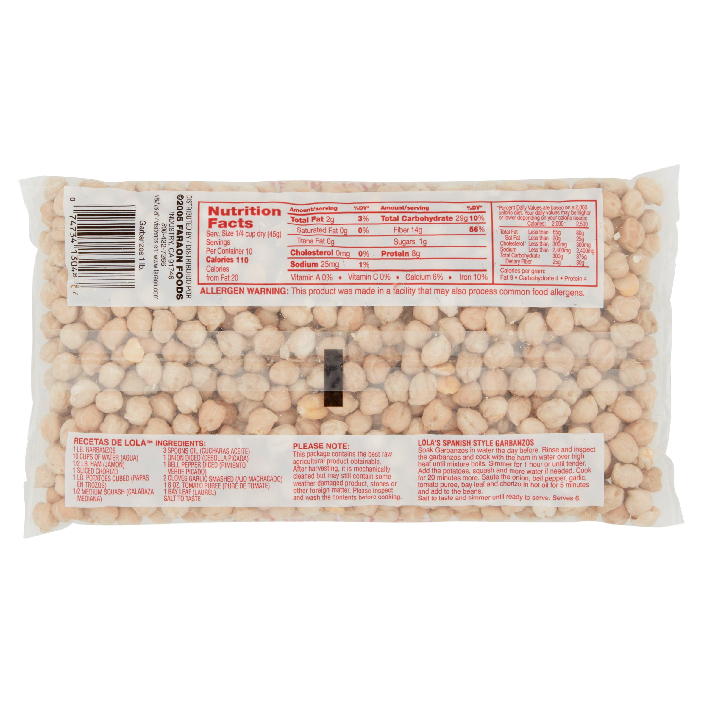 Faraon Dry Garbanzo Bean, packed in a 16 oz cello bag, is known for its taste and freshness. Faraon Garbanzo Beans are grown and harvested in the USA. Faraon Garbanzo Beans are not only nutritious, but they are also a great family value. Faraon Garbanzo Beans contain 0% saturated fat and 0 grams of trans fats.