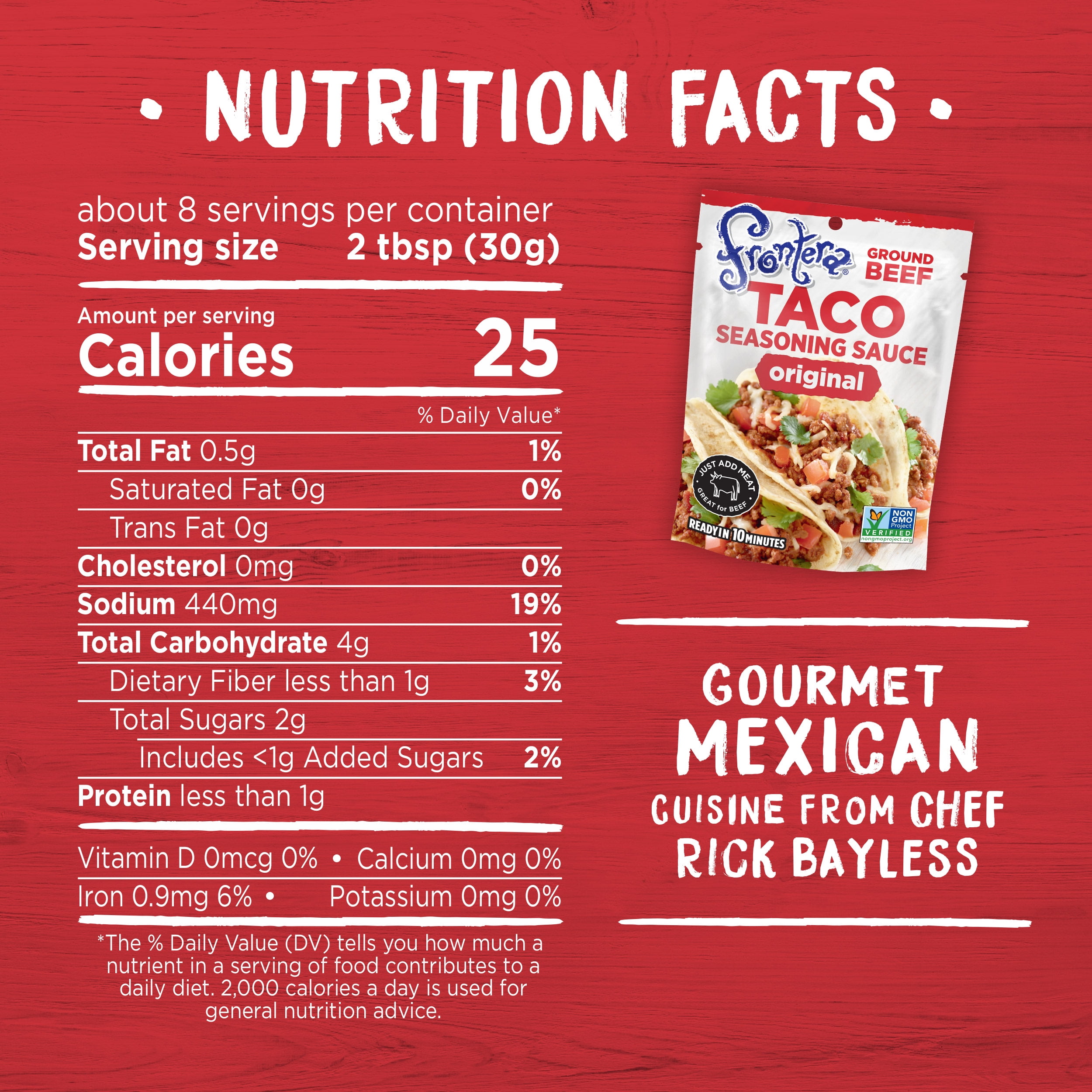 Did someone say 10 minutes to tacos? Spice things up on Mexican night with the original flavor of Frontera Taco Seasoning Sauce With Fire Roasted Tomatoes. Made with chipotle, fire roasted tomatoes and other classic seasonings, this taco seasoning sauce takes your tacos to next-level delicious. Simply brown 1 pound of ground beef or your favorite taco meat, add the taco seasoning sauce, heat through and enjoy. Frontera Taco Seasoning Sauce is Non-GMO Project Verified and made with high-quality ingredients. Frontera: Gourmet Mexican Cuisine.