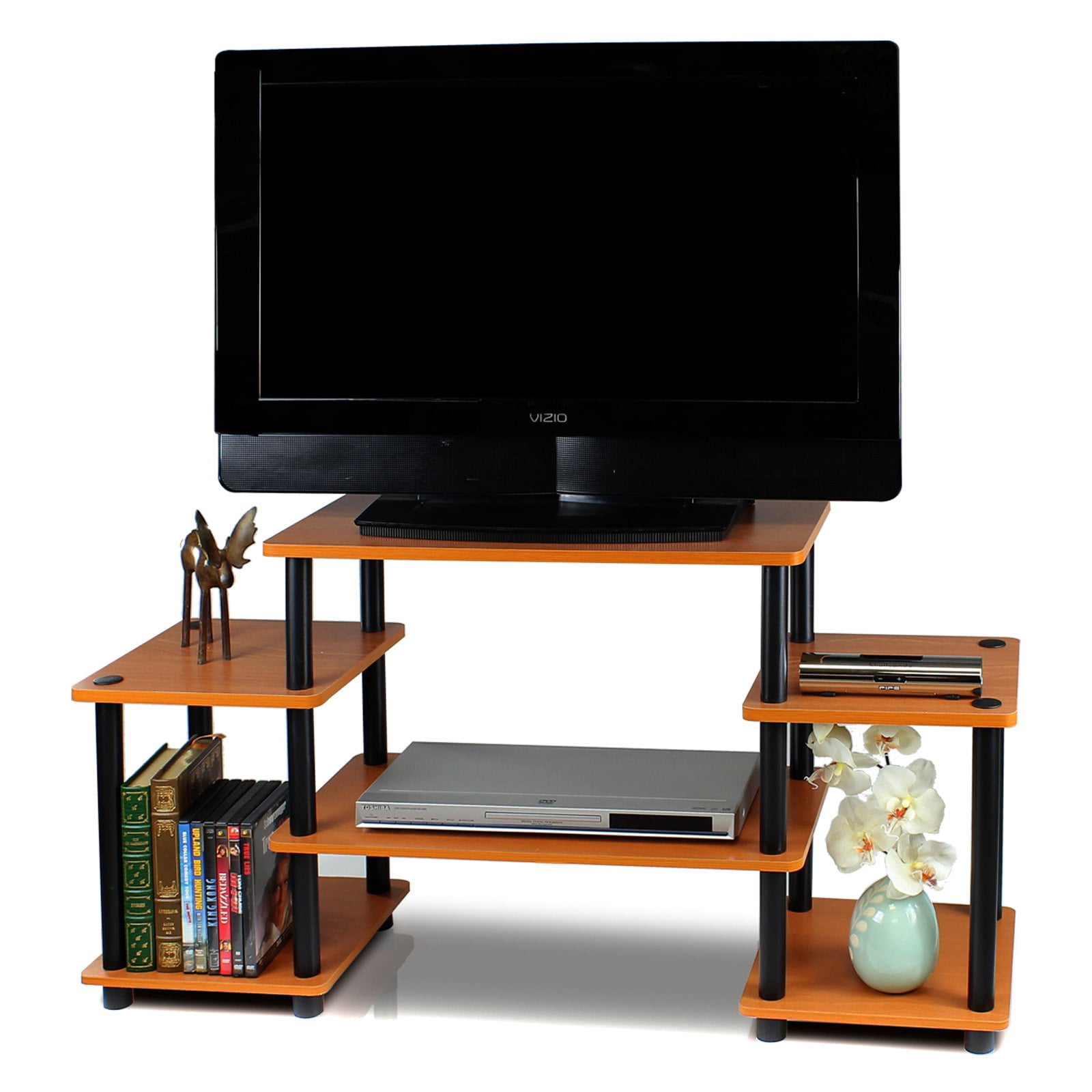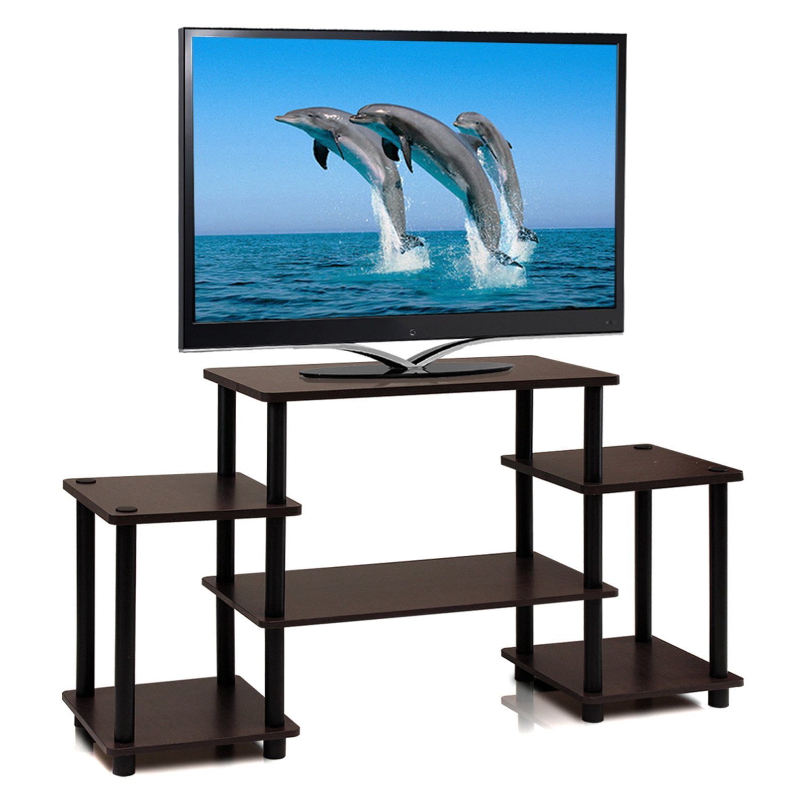 Get simple, savvy storage with the Furinno Turn-N-Tube No Tools Entertainment Center. Five spacious open-storage shelves are ideal for organizing electronics or media, and the stand accommodates TVs up to 37 inches wide. No-tools assembly means anyone can build this stand in a flash. This stand is as smart as it is functional thanks to its primarily recycled-material construction. Stylish and unfussy, this stand is an ideal storage solution for any living room or den.
