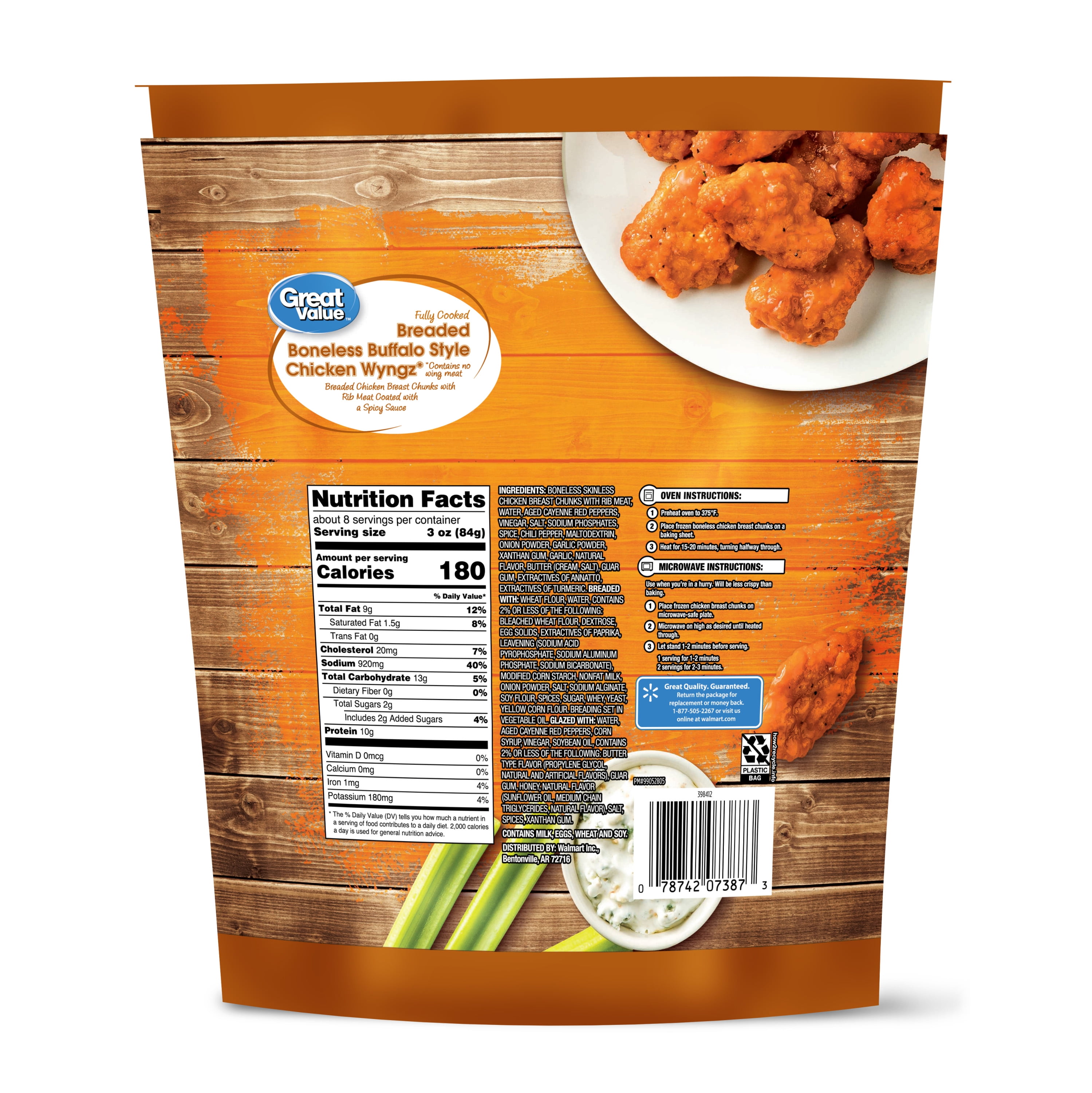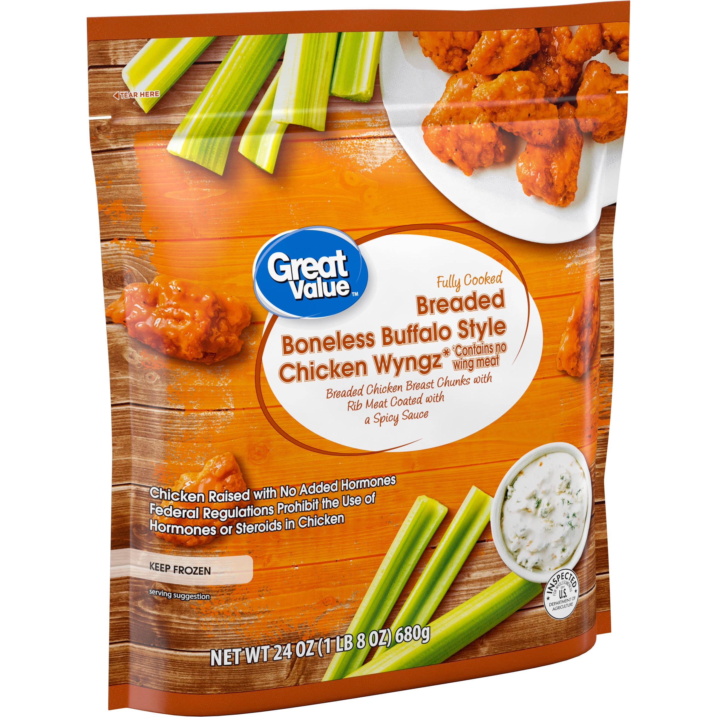 Impress family and friends alike at your next gathering with Great Value Buffalo Style Seasoned Boneless Fully Cooked Breaded Chicken Wyngz. These fully cooked chicken wings are a great tasting, quick, and convenient meal for the entire family. Breaded and covered in a spicy and savory buffalo style seasoning, these delicious chicken wings contain eleven grams of protein per serving. A perfect weekday meal with family or as an appetizer for a weekend gathering, these fully cooked frozen chicken wings are easy to prepare. Simply place in an oven, air fryer or microwave until hot. Includes one package of Great Value Buffalo Style Seasoned Boneless Fully Cooked Breaded Chicken Wyngz.