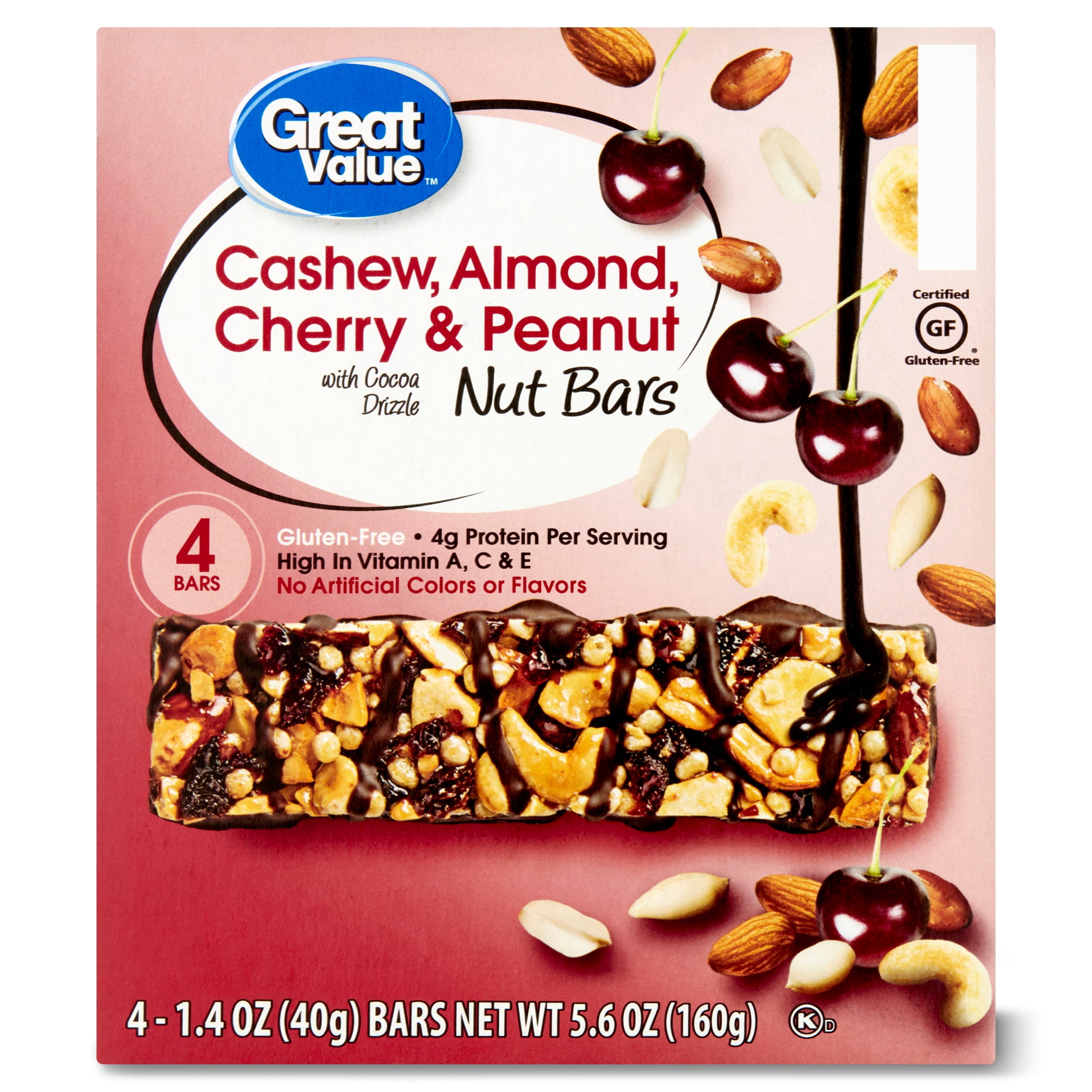 Great Value Cashew, Almond, Cherry, & Peanut Nut Bars with Cocoa Drizzle, 5.6 oz, 4 Count