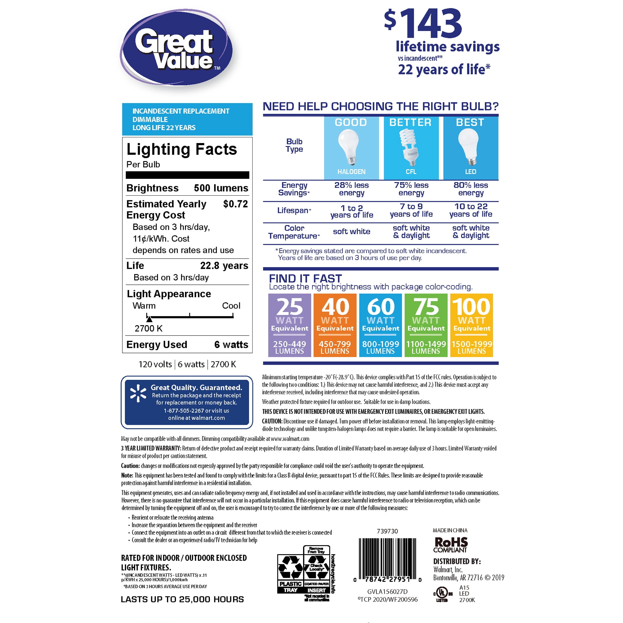 Great Value LED Light Bulb, 6W (60W Equivalent) A15 Ceiling Fan Frosted Lamp E26 Medium Base, Dimmable, Soft White, 1-Pack