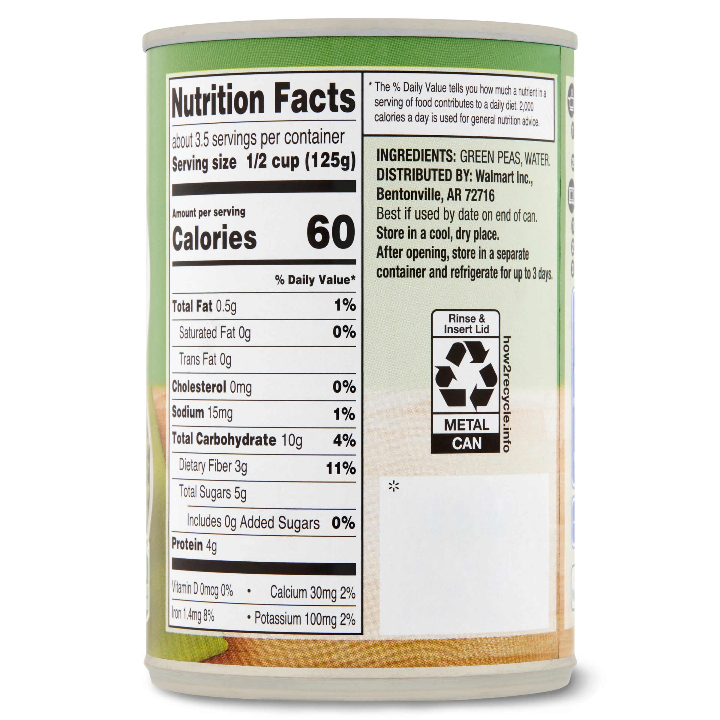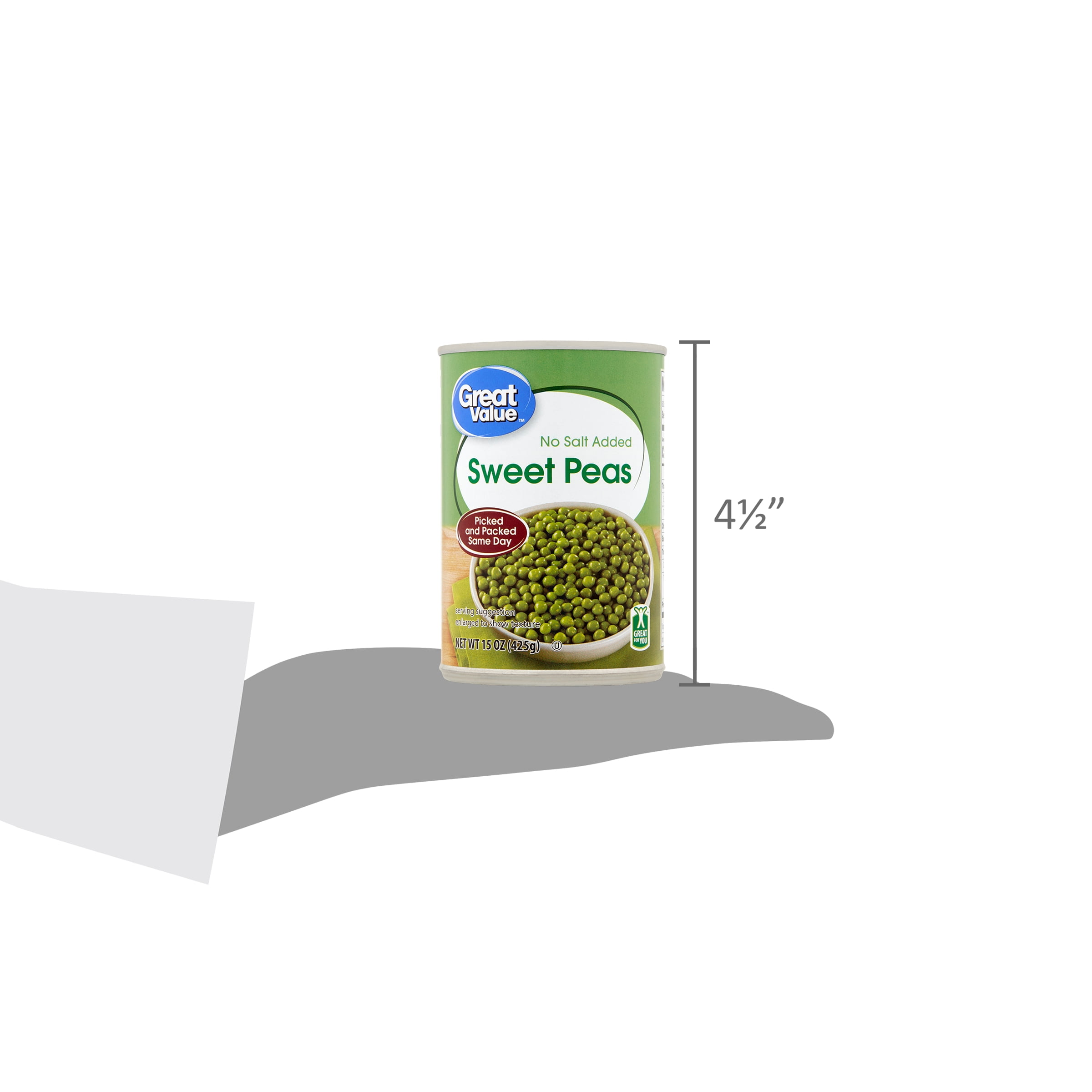 Eating your veggies just got easier with Great Value No Salt Added Sweet Peas. Whether you want to make a vegetable soup, vegetable casserole, or your very own homemade recipe, Great Value No Salt Added Sweet Peas have you covered. With no added salt, chemicals, or sugars, Great Value No Salt Added Sweet Peas are picked and packed in the same day, ensuring farm-fresh flavors perfect for delicious, easy, and quick dinner ideas. Great Value No Salt Added Sweet Peas are not only fast and easy to prepare but sure to satisfy. Ready in minutes, all you have to do is warm in a saucepan on the stove or heat in a microwave-safe dish in the microwave. Add great flavor to your meals with Great Value No Salt Added Sweet Peas.