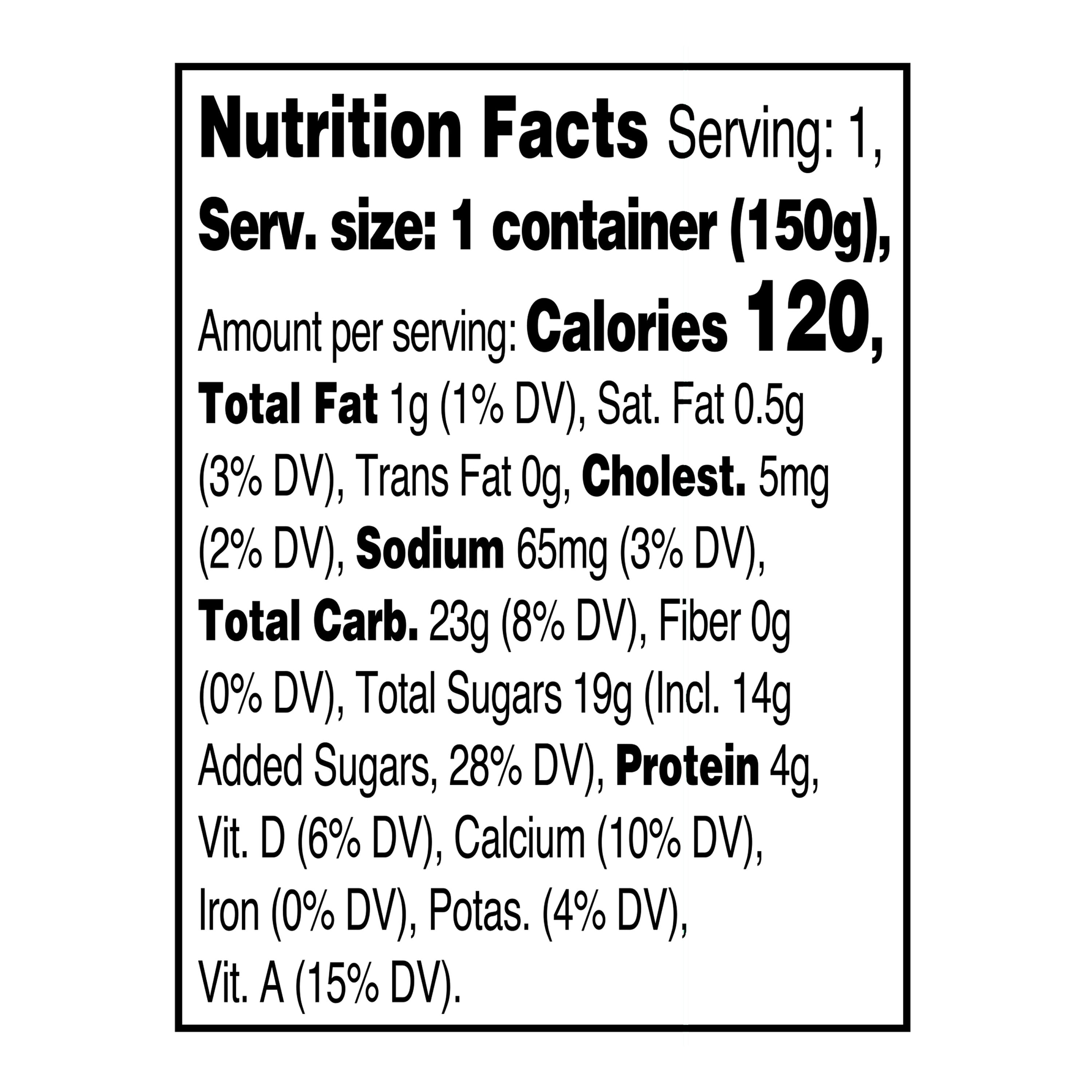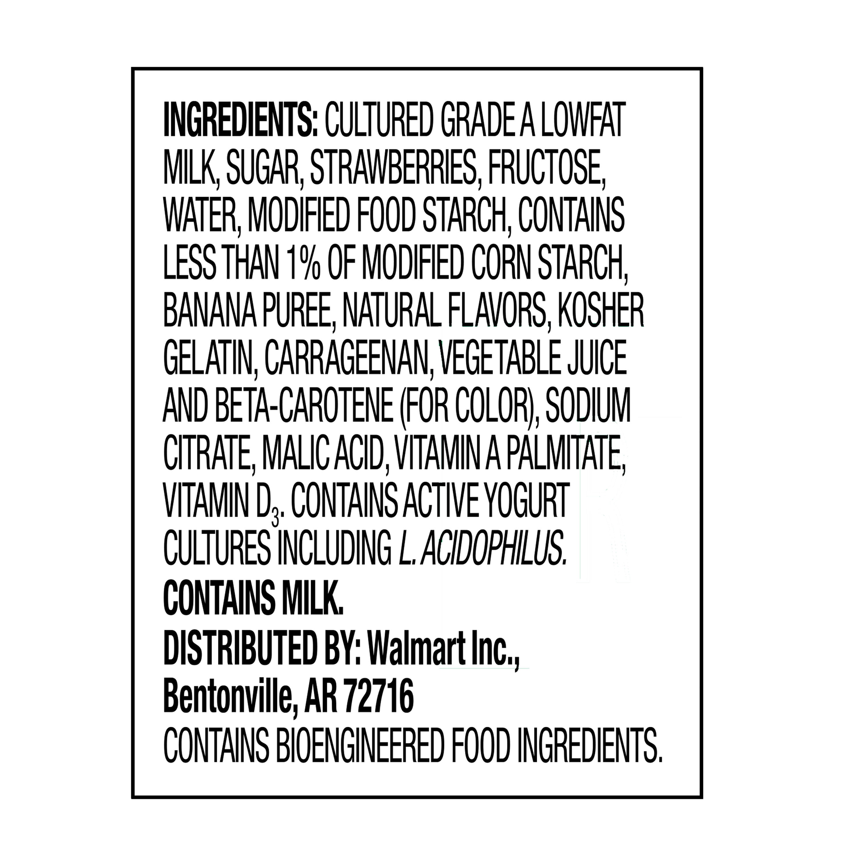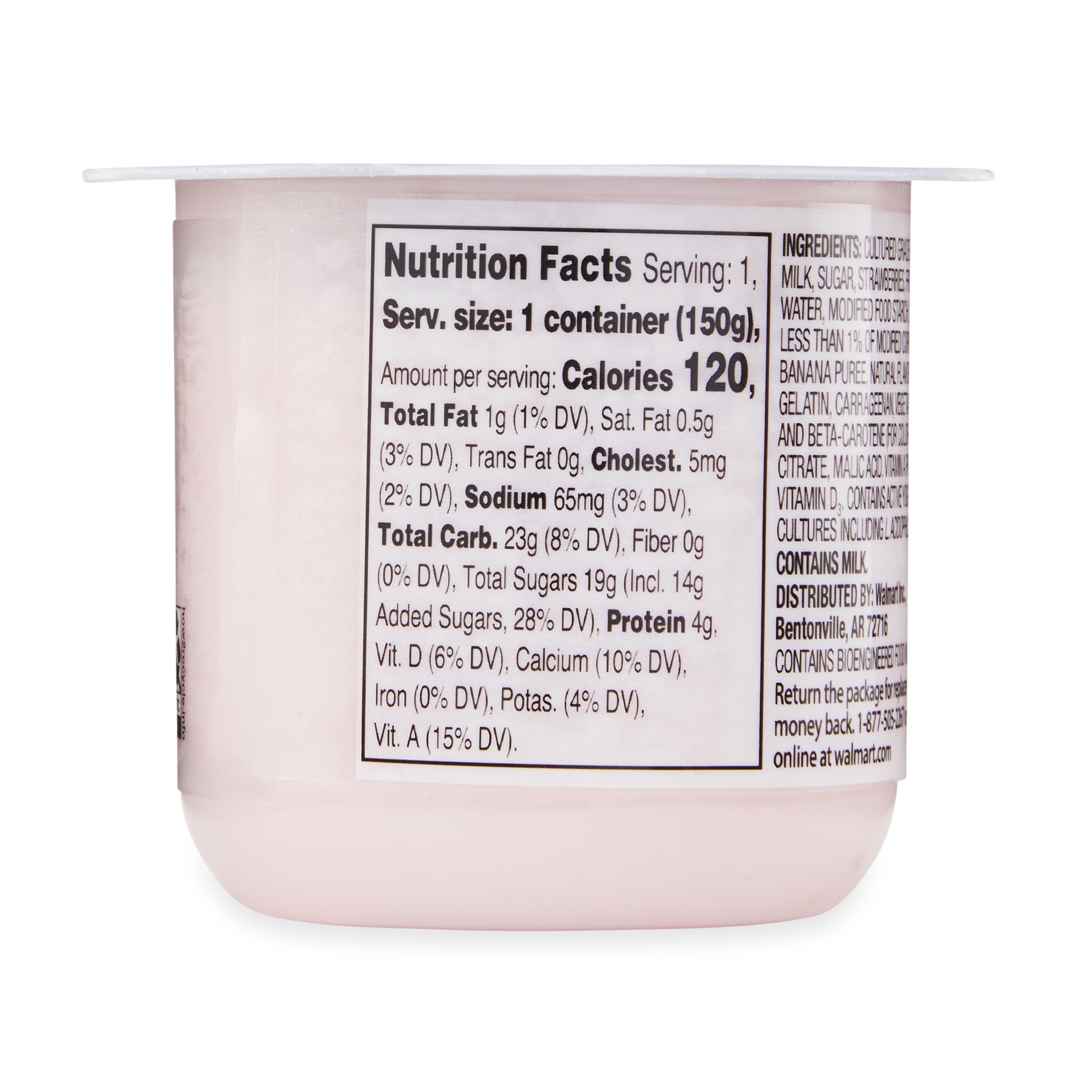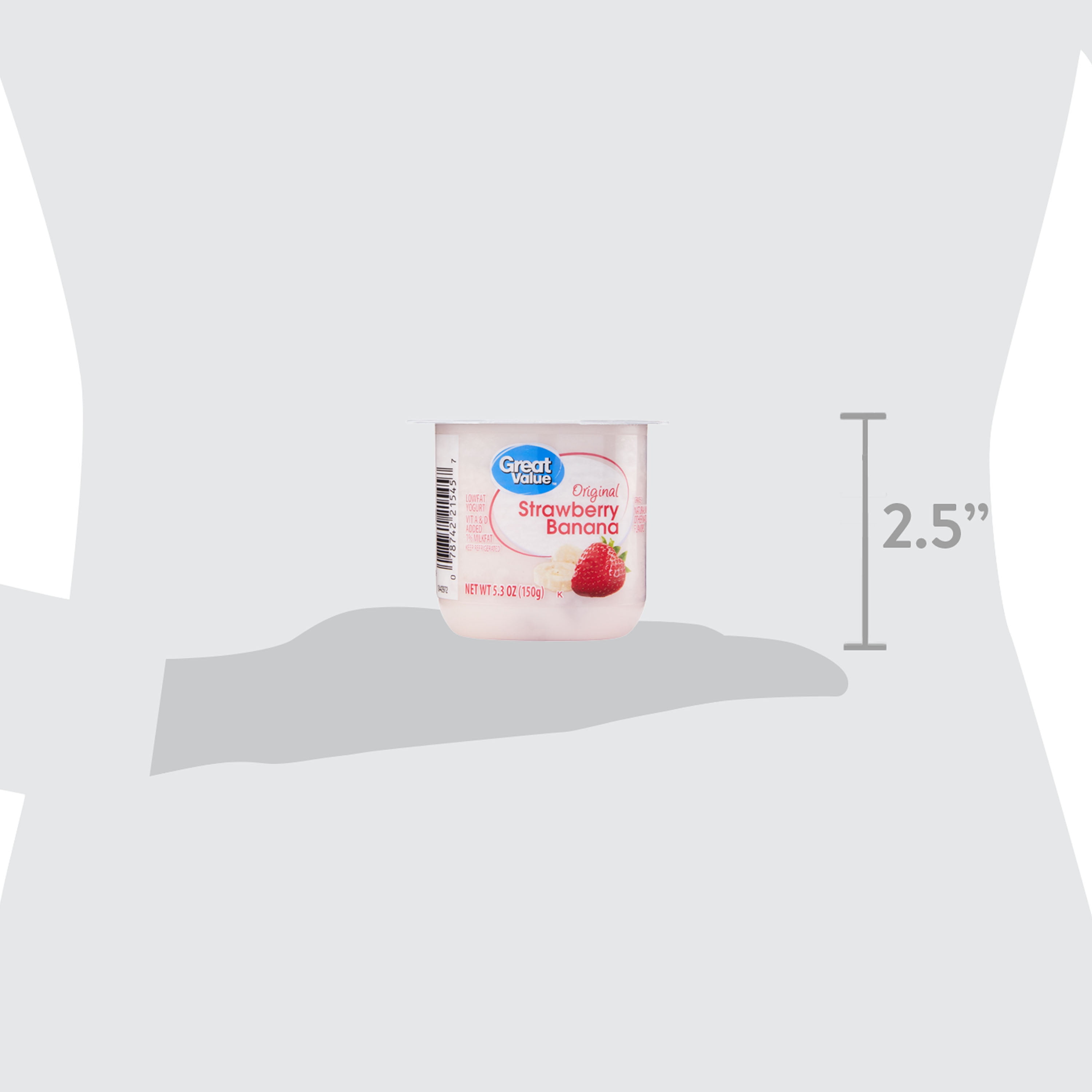 Savor the sweet taste of strawberries and bananas with Great Value Original Strawberry Banana Lowfat Yogurt. Made with Grade A low fat milk, this delicious treat is a good source of protein, vitamin D, calcium, and vitamin A, while clocking in at only 120 calories per serving. You can easily grab a cup while on your way out the door in the mornings for a quick breakfast on the go, pack in a lunch bag for school or work, or treat yourself to a refreshing and wholesome snack in the afternoon or while watching TV or reading a good book before bed. Treat yourself to low fat deliciousness and pick up a cup of Great Value Original Strawberry Banana Lowfat Yogurt today.
