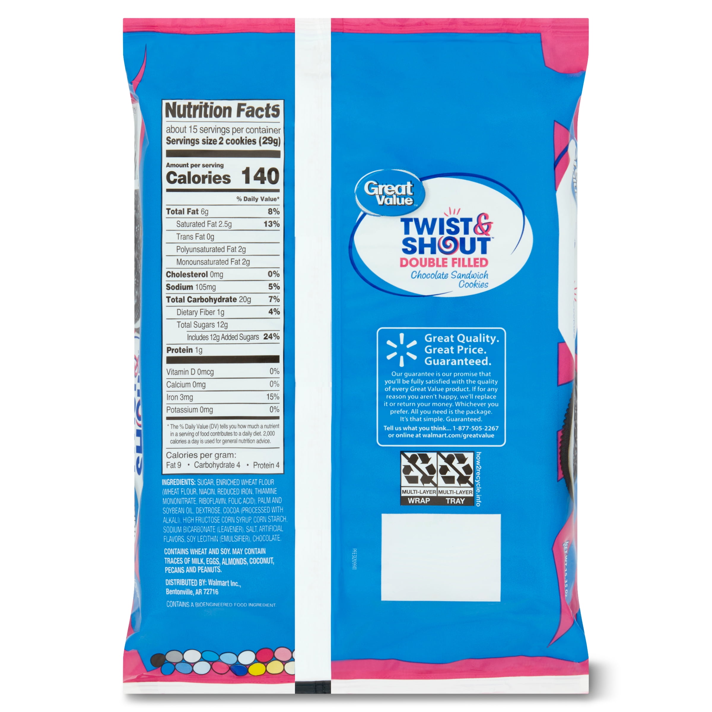 Double down on sweet indulgence anytime with Great Value Twist & Shout Double Filled Chocolate Sandwich Cookies. These satisfying chocolate cookies are sandwiched around twice the amount of sweet filling contained by similar cookies. Enjoy them with cold milk for a classic sweet snack. Expand your dessert routine by crumbling them as a topping on ice cream or blitzing them in a food processor to make an outstanding crust for homemade pies. This 15.35-ounce package includes 15 servings of these tasty sandwich cookies, so you can be sure to keep everyone happy. Whether you slip them into school lunches or save them for after-dinner treats, Great Value Twist & Shout Double Filled Chocolate Sandwich Cookies will satisfy every sweet tooth in your family. Great Value products provide families with affordable, high-quality grocery and household consumable options. With our wide range of product categories spanning grocery and household consumables, we offer you a variety of products for your family’s needs.