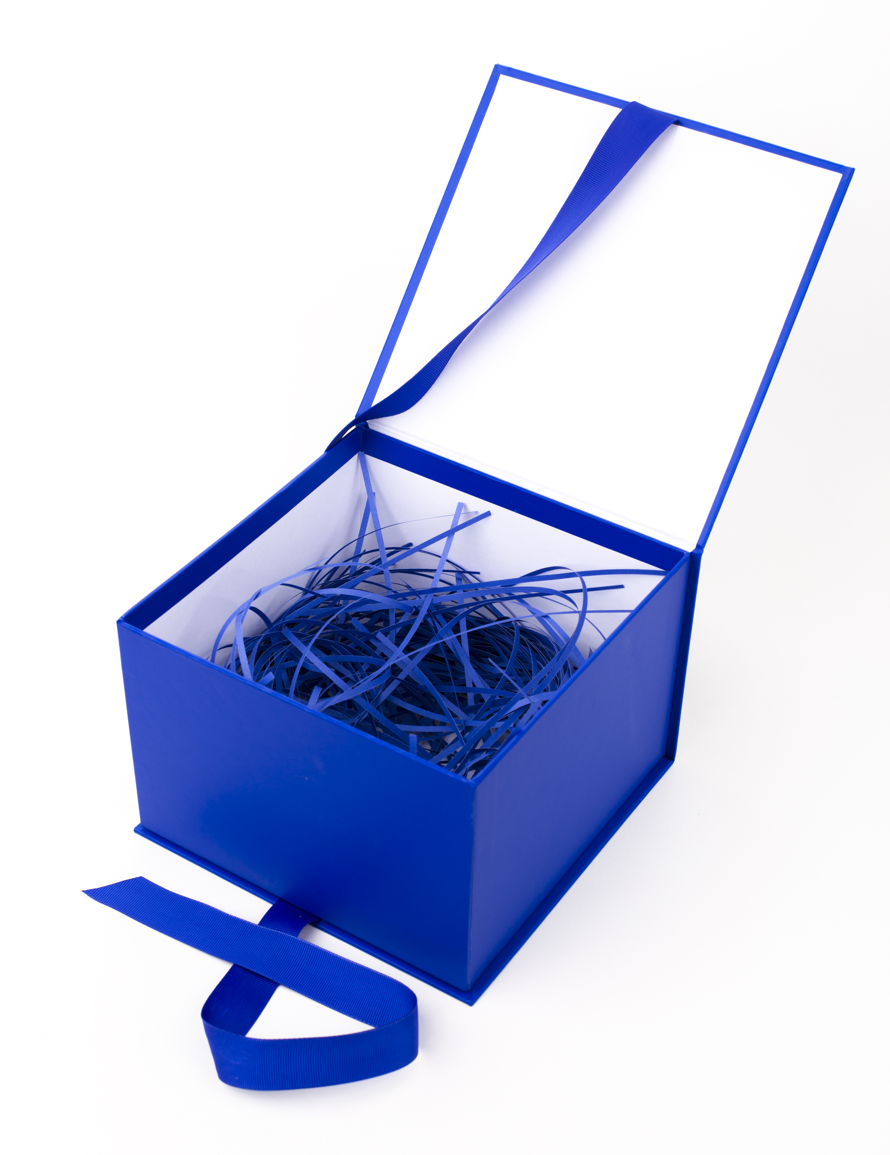 - Impress any gift recipient with this navy blue gift box, complete with a matching ribbon to tie the box closed and blue shredded paper on the inside. Make your gift stand out for baby showers, birthdays, anniversaries, or any other gift-giving occasion.