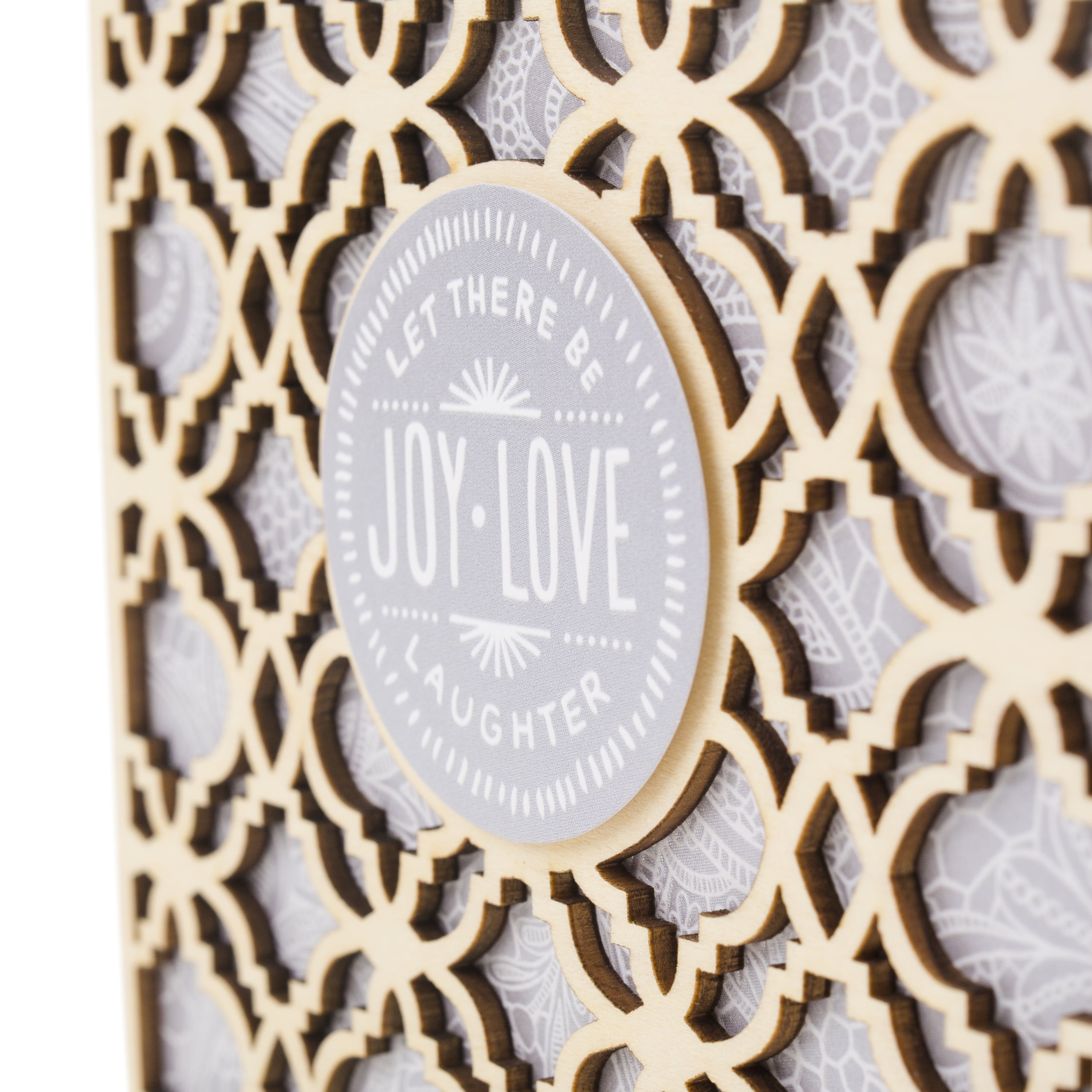 - Cover features white block lettering, reading: "Let there be Joy, Love, Laughter," and laser-cut wood in a geometric pattern overlaying a white and gray floral background.
