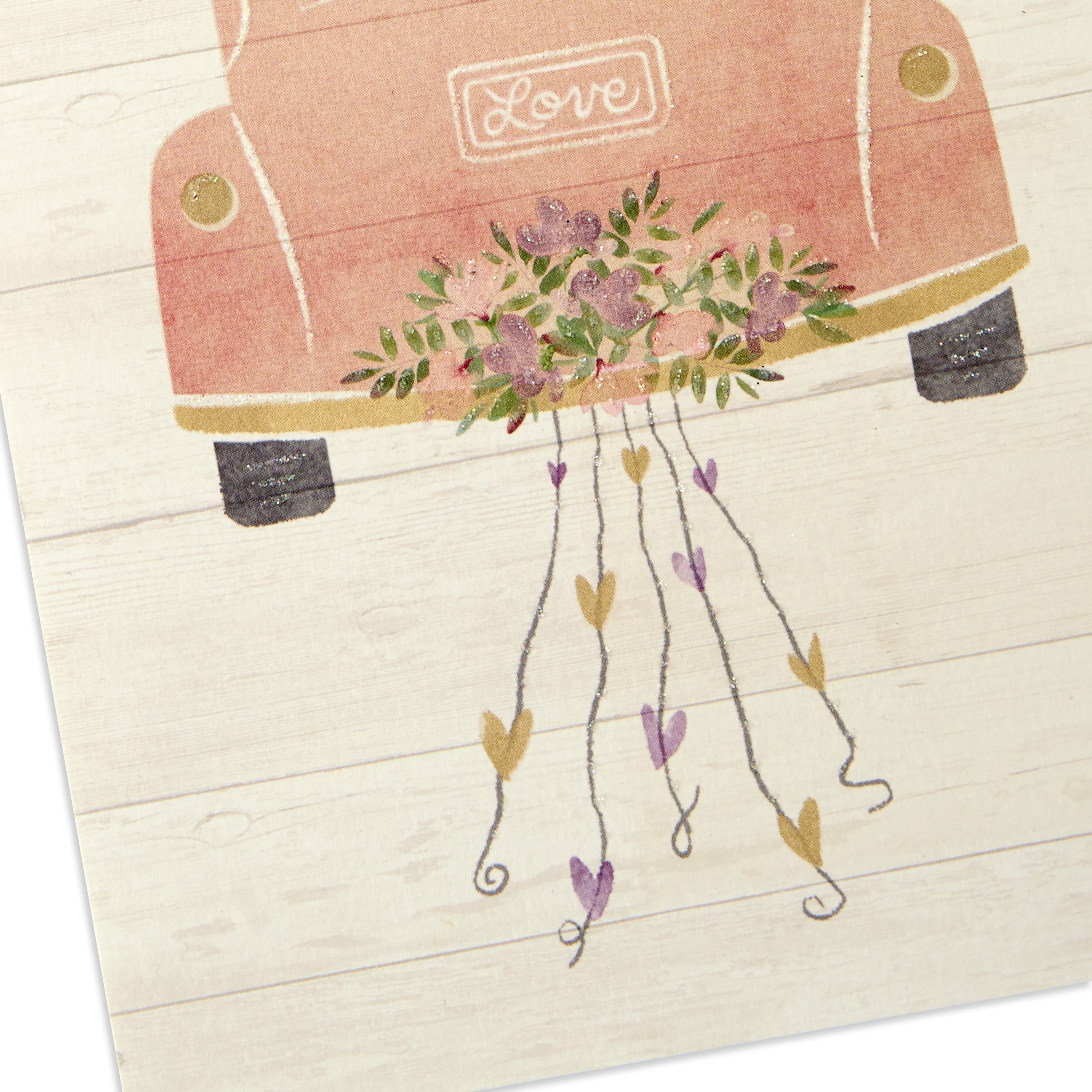 - Cover features a pink car decorated with a bouquet of flowers and heart streamers, accented with a natural twine embellishment. Inside reads: "The two of you are on your way to a lifetime of happiness and love. Enjoy the journey!"