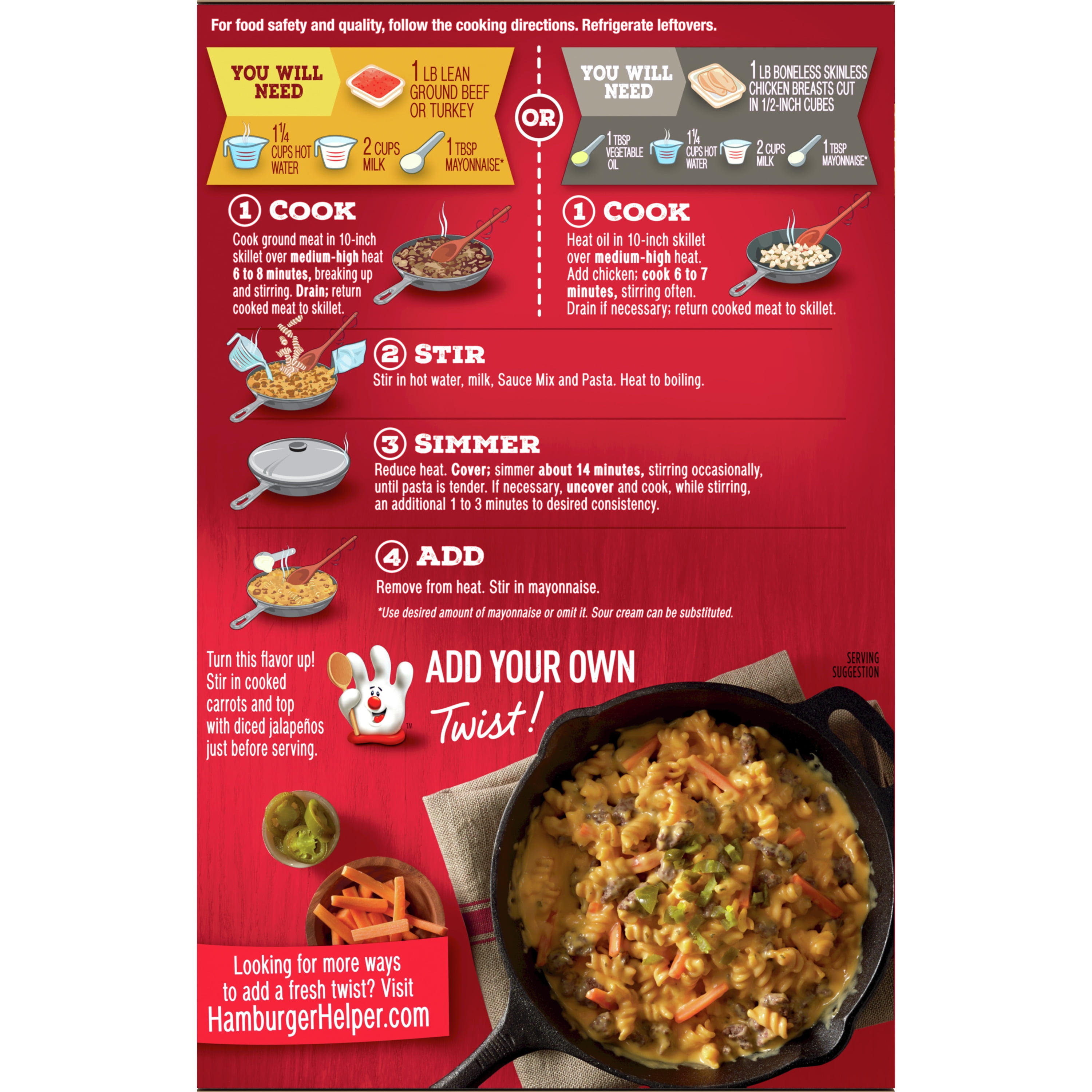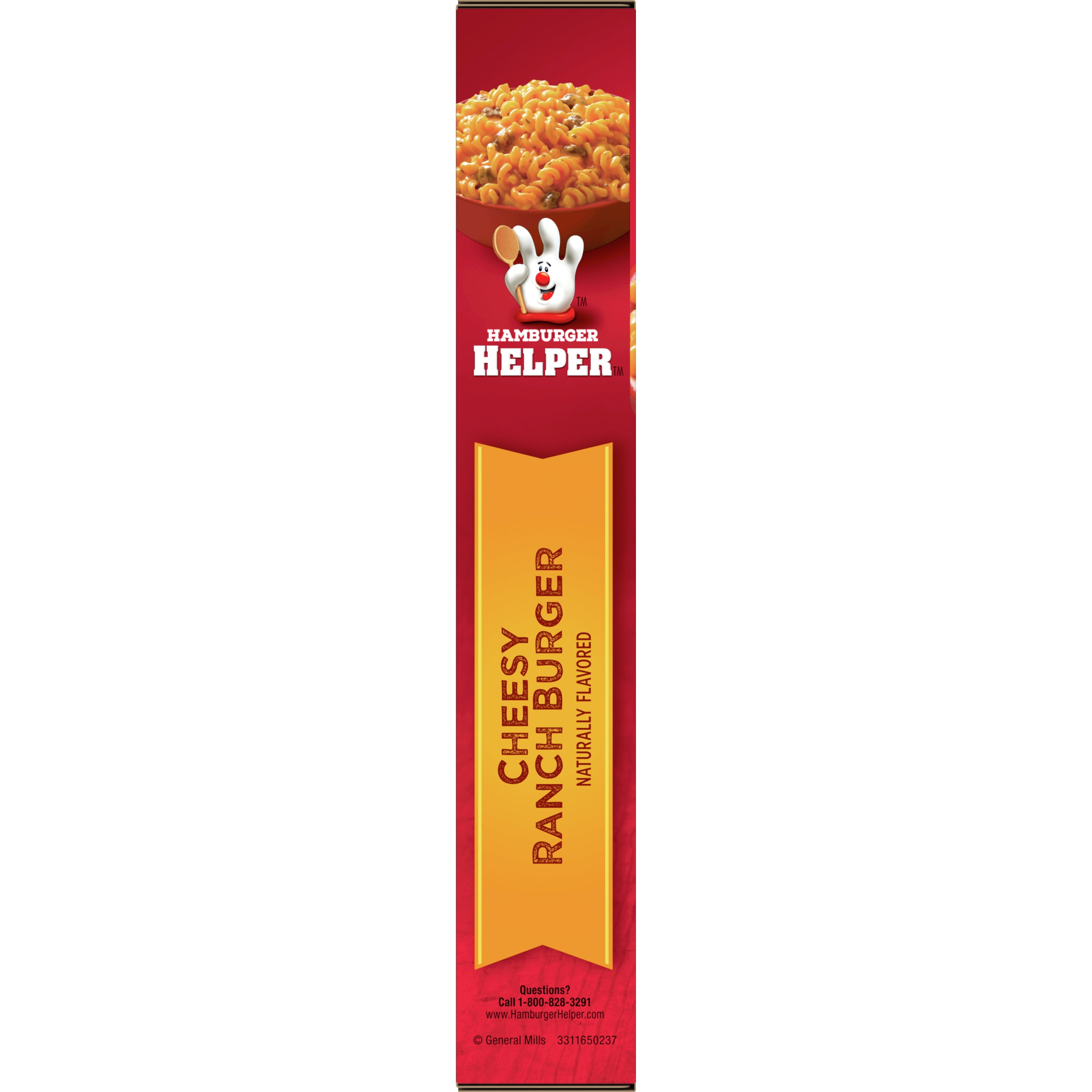 Cheesy Ranch Burger Hamburger Helper has no artificial flavors. Add Your Own Twist! Turn this flavor up! Stir in cooked carrots and top with diced jalapenos just before serving.