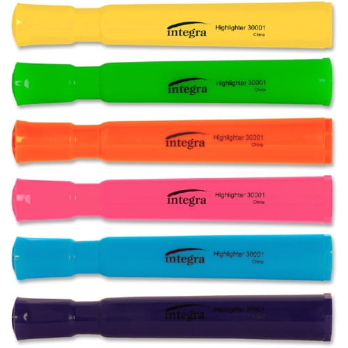 Integra Chisel-Tip Desk Highlighters in assorted colors are ideal for marking and underlining any important information on printed materials for reference. Each one offers a large barrel and chisel tip that applies ink smoothly and evenly. The transparent liquid ink stays bright and resists fading. These Integra highlighters can be used in homes, offices, schools and more.