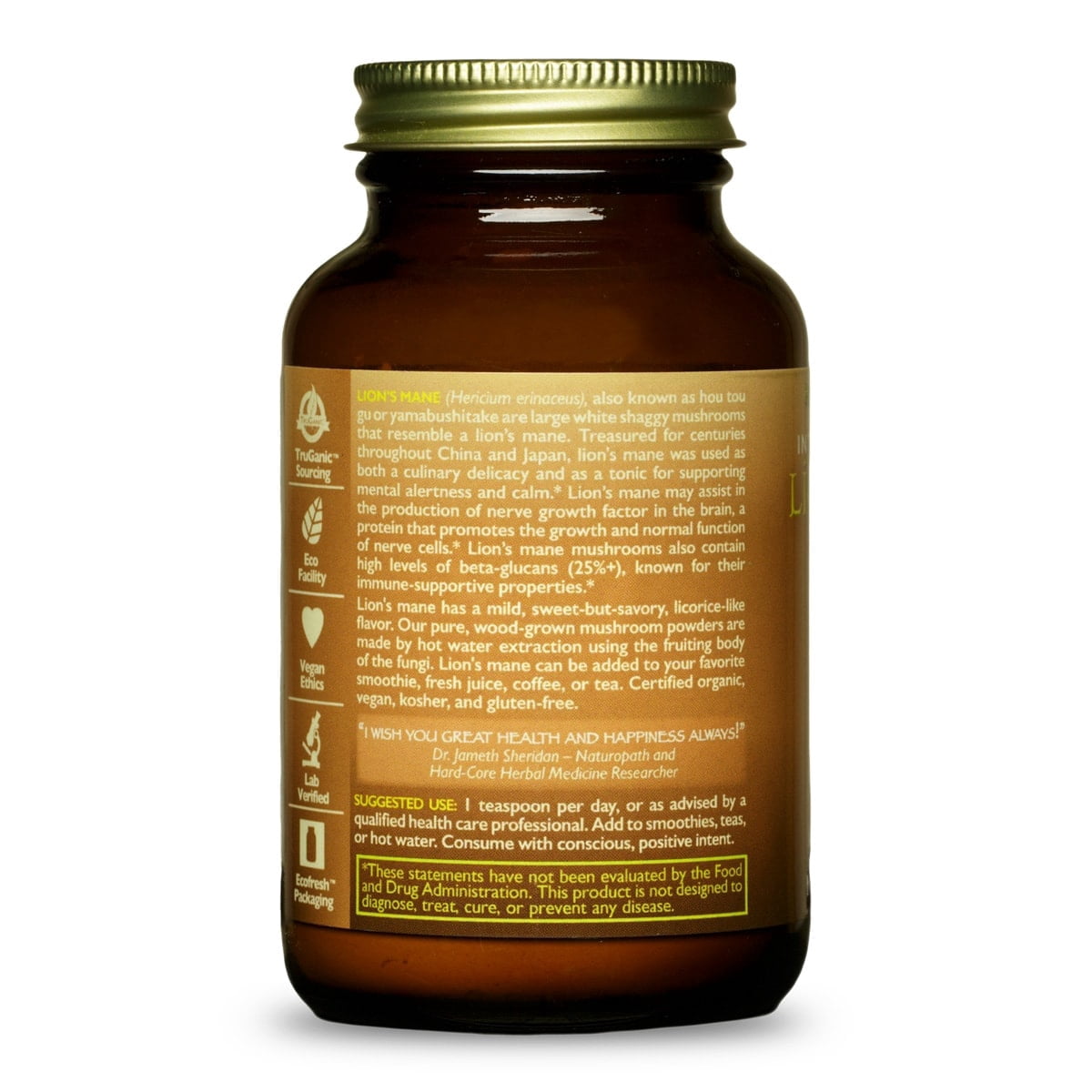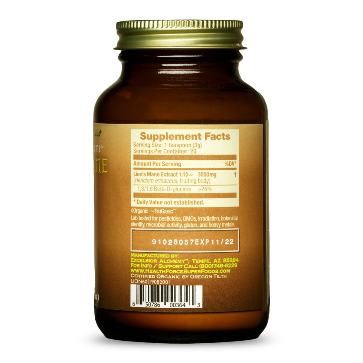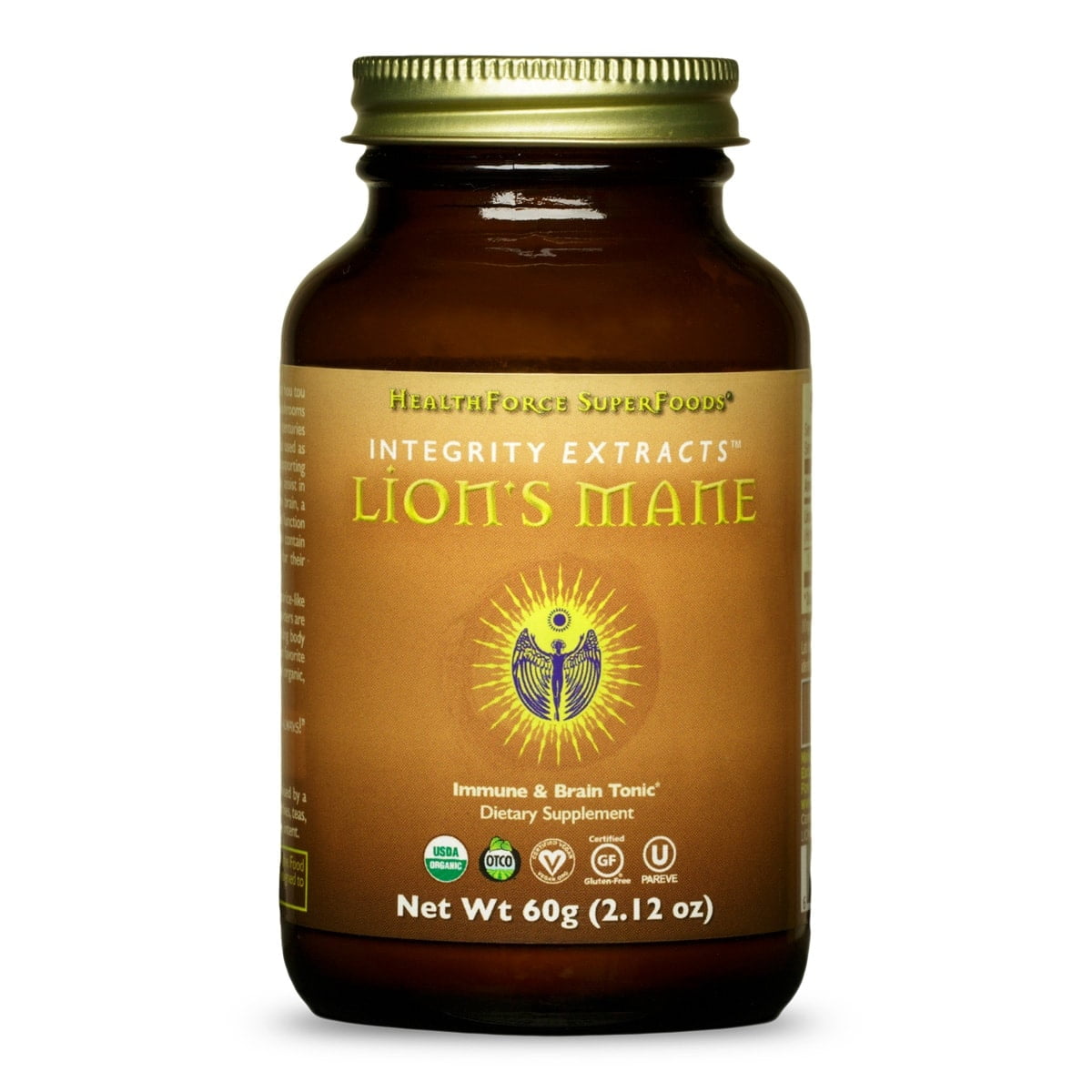 POWERFUL BRAIN SUPPORT: 100% pure organic whole mushroom fruiting body full-spectrum extract. Lion’s mane mushroom boosts nerve growth factor, helping with brain repair, maintenance, and regeneration. Enhances memory and concentration. VITAL HEALTH BENEFITS: Contains high levels of beta-glucans (25%+) known for their immune-supportive properties and antioxidants for increased vitality. FRUITING BODY EXTRACT: 100% hot water extracted, wood-grown mushroom fruiting bodies. 100% functional ingredients. No fillers, starch, grains, carriers, or drying mediums. HARD-CORE STANDARDS: Certified organic, vegan, kosher, and gluten-free. Our TruGanic™ Sourcing standard includes lab testing for GMOs and pesticides. No fillers, binders, flow agents. GLASS PACKAGING: Product packaged in recyclable amber glass bottle which includes oxygen absorber and use of airtight metal lid. HIGHEST MANUFACTURING STANDARDS: Family owned and operated. Made in the U.S. in certified organic, certified kosher, vegan facility. FDA registered cGMP compliant. USDA ORGANIC: Powder only. For more product details including testing and nutritional facts please see the official HealthForce SuperFoods website.