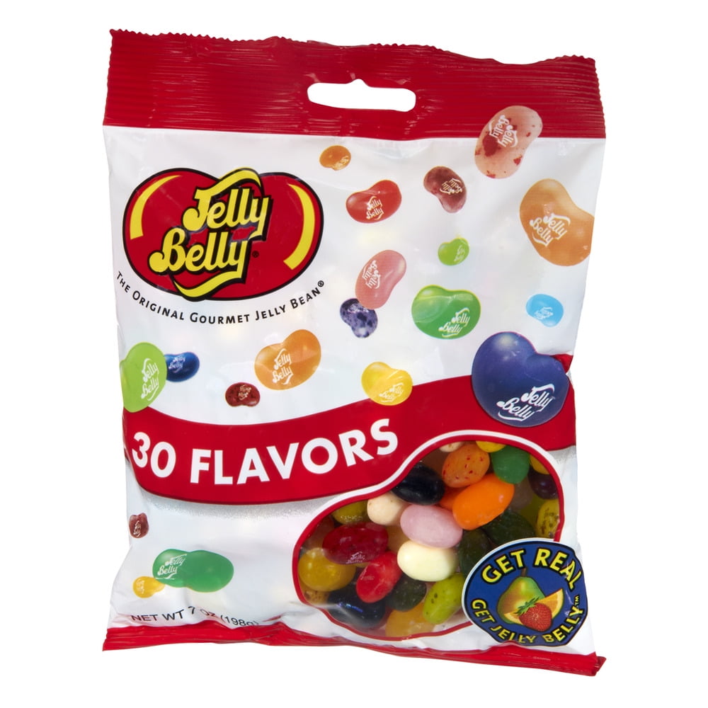 Jelly Belly® 30 Flavors Jelly Beans. The original gourmet jelly bean. Naturally and artificially flavored with blueberry, bubble gum, buttered popcorn, cappuccino, caramel corn, chocolate pudding, coconut, cotton candy, A&W® cream soda, Dr Pepper®, French vanilla, green apple, juicy pear, Sunkist® lemon, lemon lime, licorice, orange sherbet, peach, pina colada, pomegranate, red apple, A&W® root beer, sizzling cinnamon, strawberry cheesecake, Sunkist® tangerine, toasted marshmallow, top banana, tutti-fruitti, very cherry, watermelon. A fat free and gluten free product.Jelly Belly Jelly Beans:30 flavorsFat freeGluten free4 calories per beanKosher