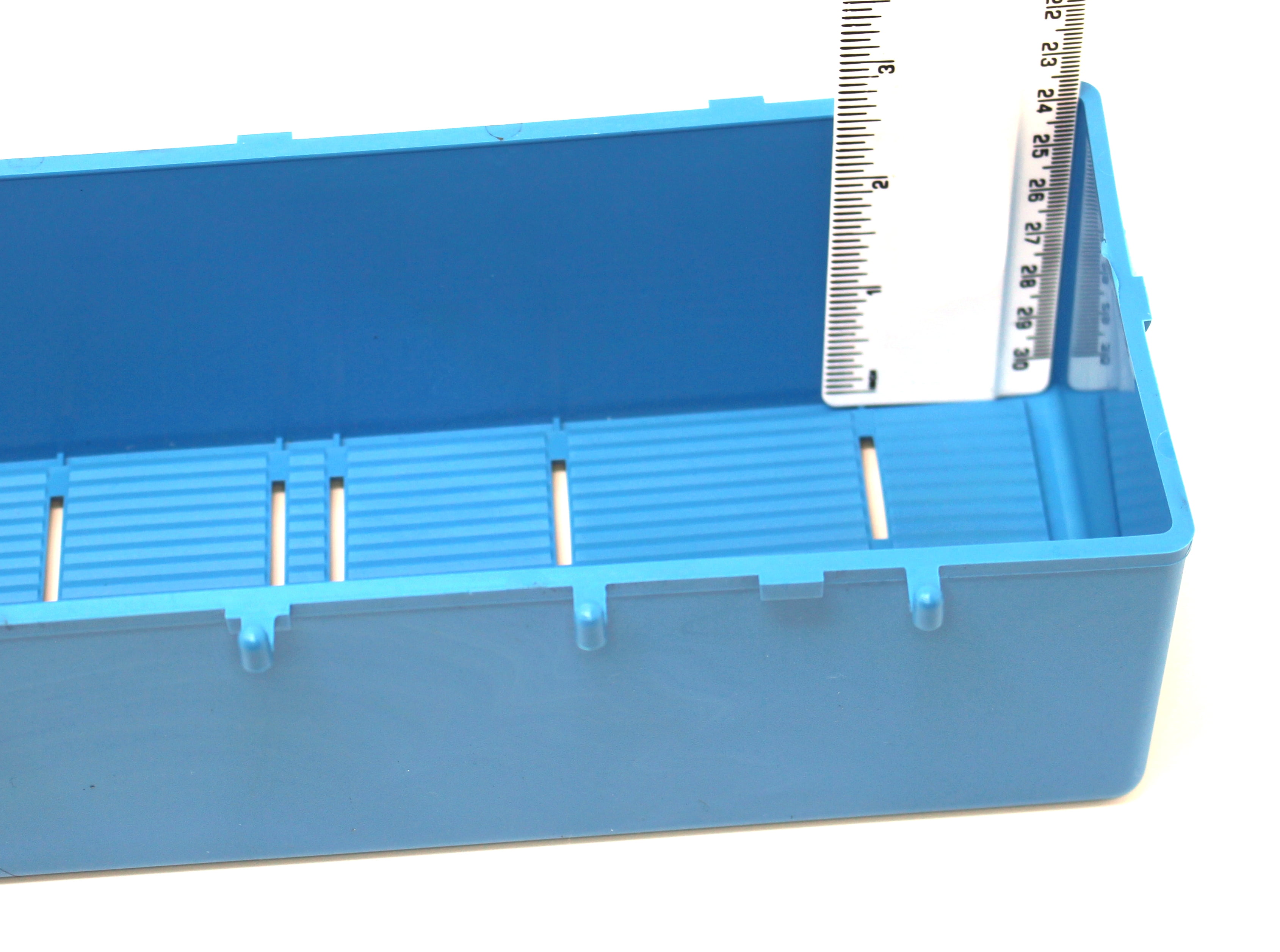 PEGBOARD STORAGE BOX: Blue Heavy-Duty Bin. Which measures 11 1/4 Inches Wide x 4 Inches Deep x 2 3/4"Inside Height. Compare to the flimsy ones you have seen which only measure 4"W x 3"D x 2"H. See pictures on the size and quality of our Heavy-Duty Storage boxes for Peg Boards.